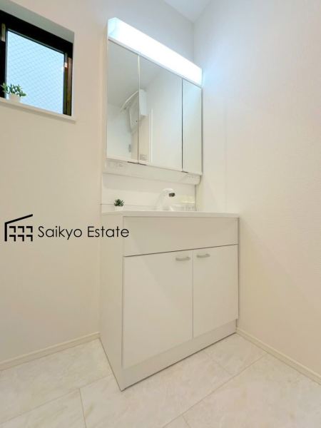 三面鏡付きの洗面化粧台を完備。収納スペースも十分ございますので、ドライヤーなどすっきりと片付きます♪(2号棟)
