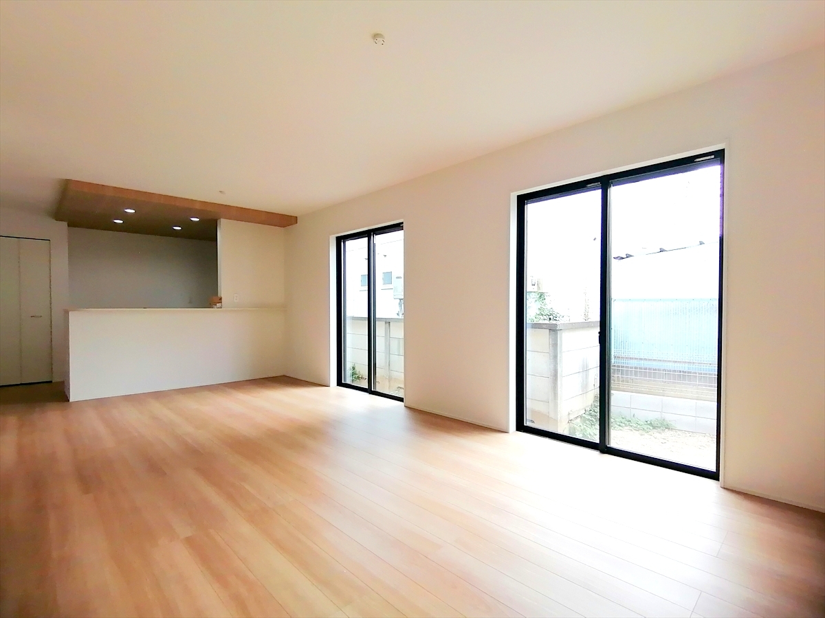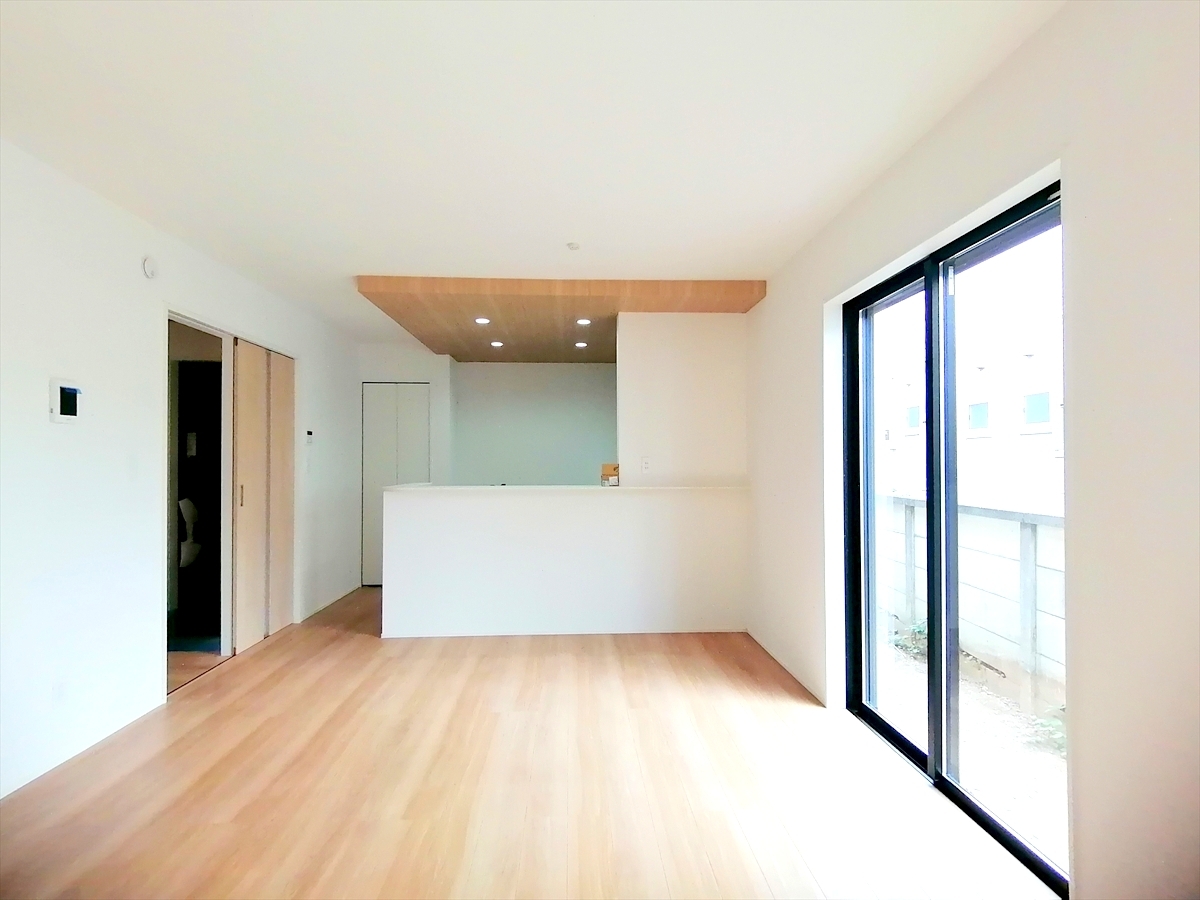 家族が集うLDKは、キッチン・ダイニング・リビングが一つの空間になった間取り。大きな窓から明るさを確保。奥様に嬉しいキッチンからLDを見渡せます。 ■府中市小柳町4 新築一戸建て■