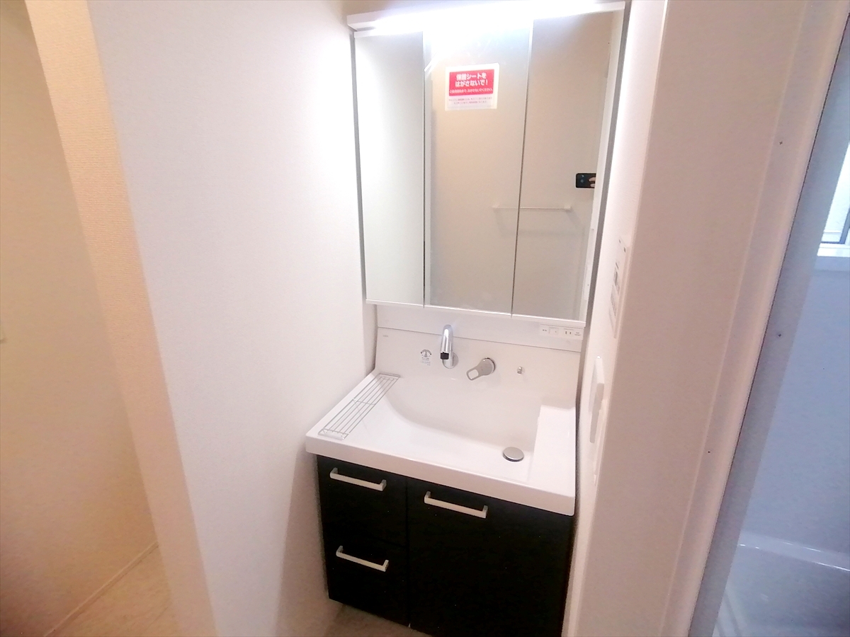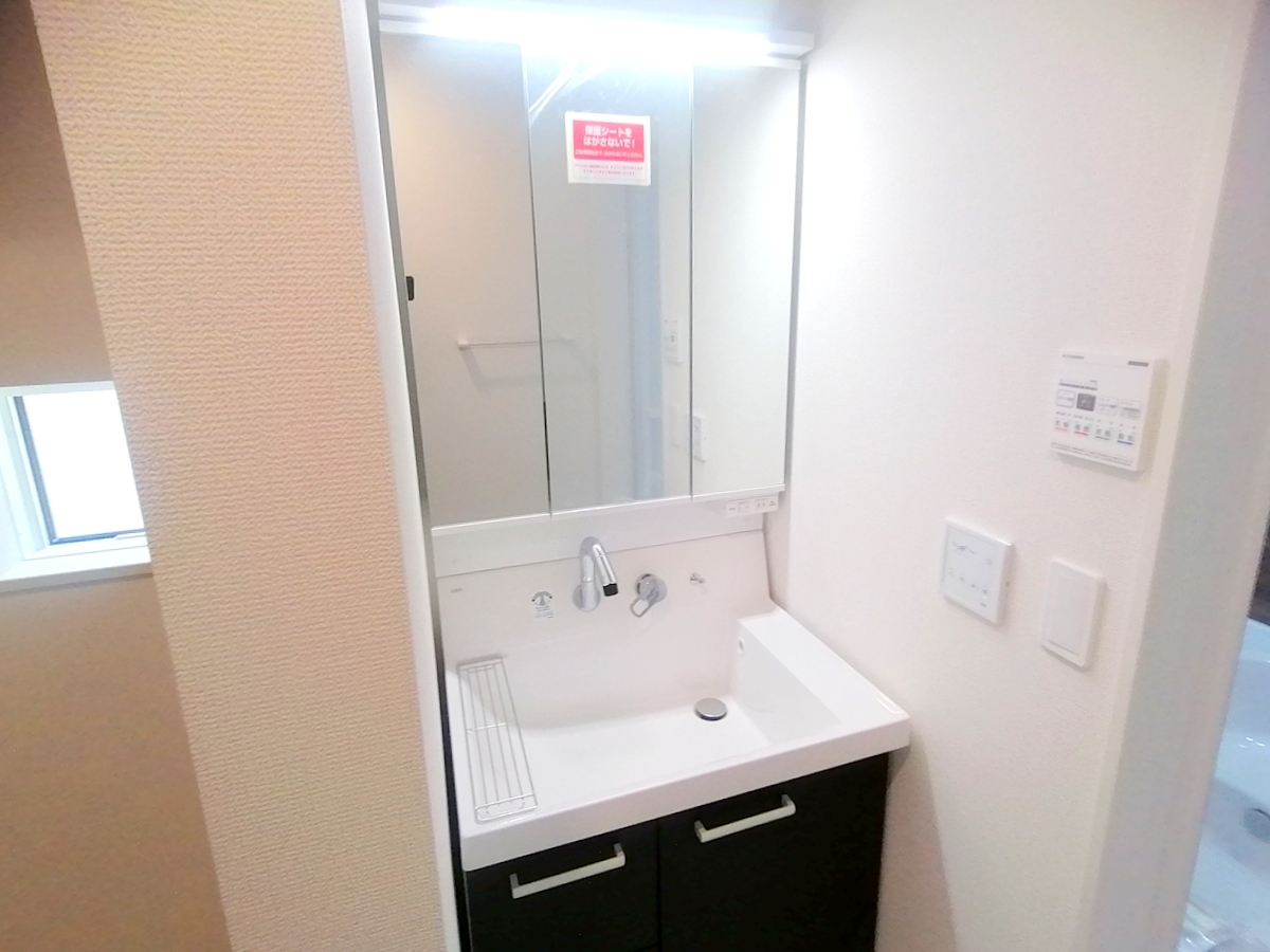 大きな三面鏡がついた洗面化粧台。鏡の裏にも収納があり洗面台がすっきりと片付きます。朝の身支度にも大変便利です。■日野市多摩平3 新築一戸建て■