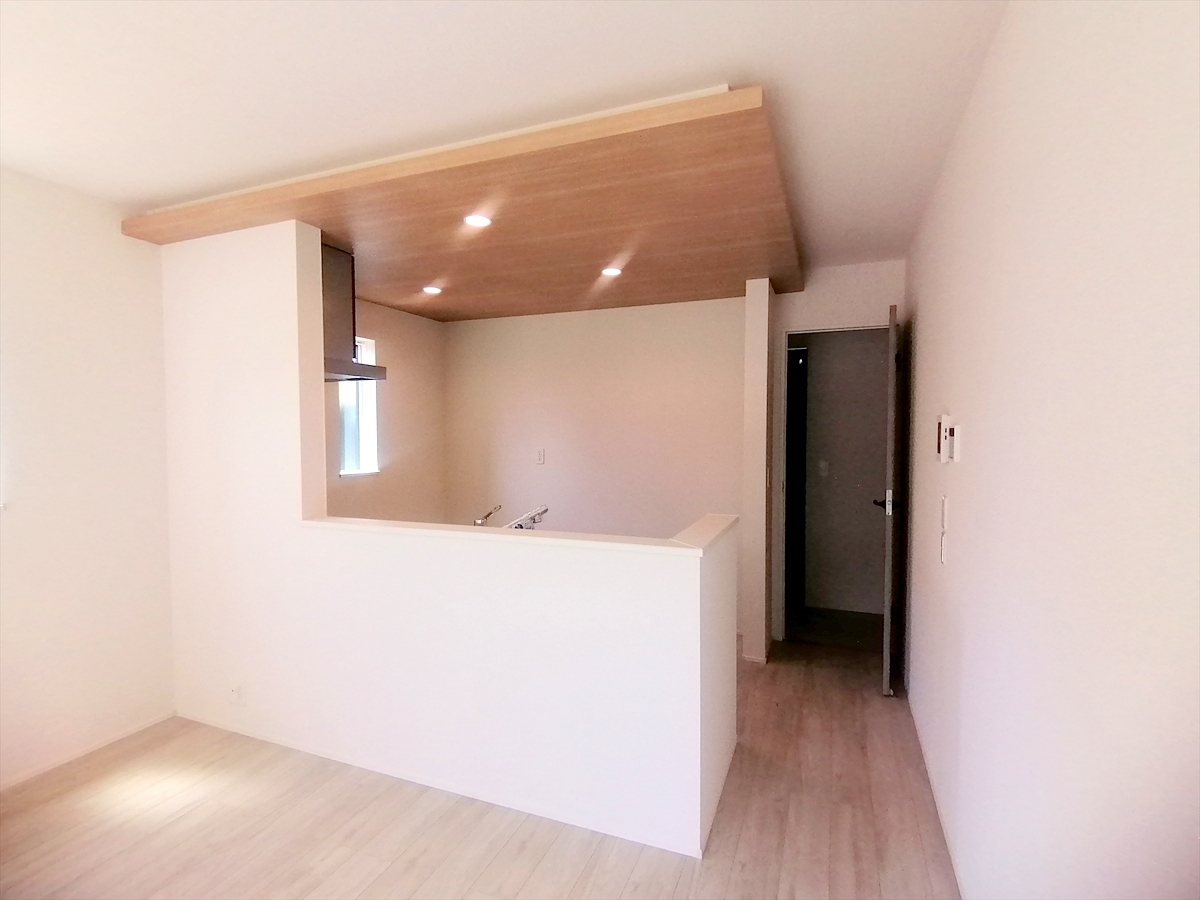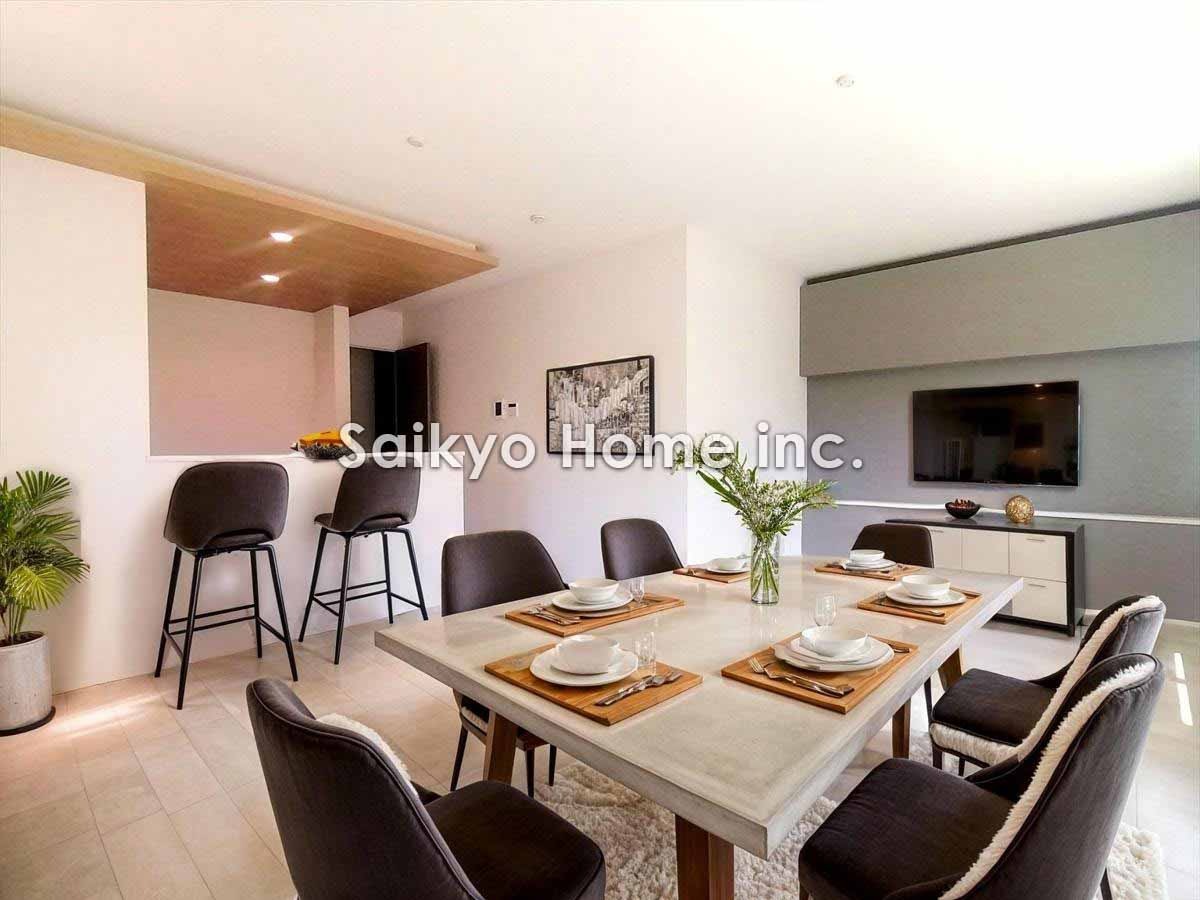 大画面TVも余裕、インテリアプランが考えやすいワイドなリビング。対面キッチンでリビングにいるお子さまにも目が届きます。 ※家具はCG加工しております。■日野市多摩平3 新築一戸建て■