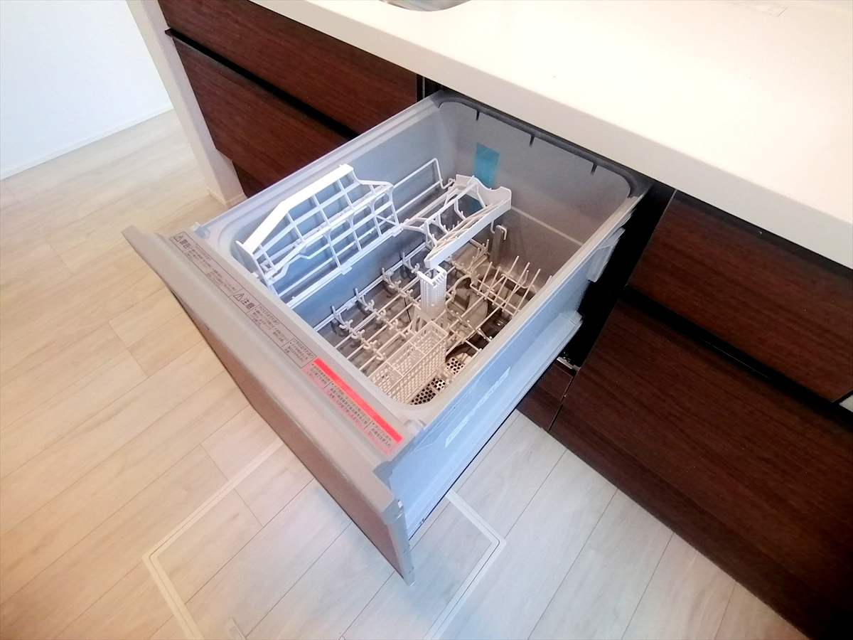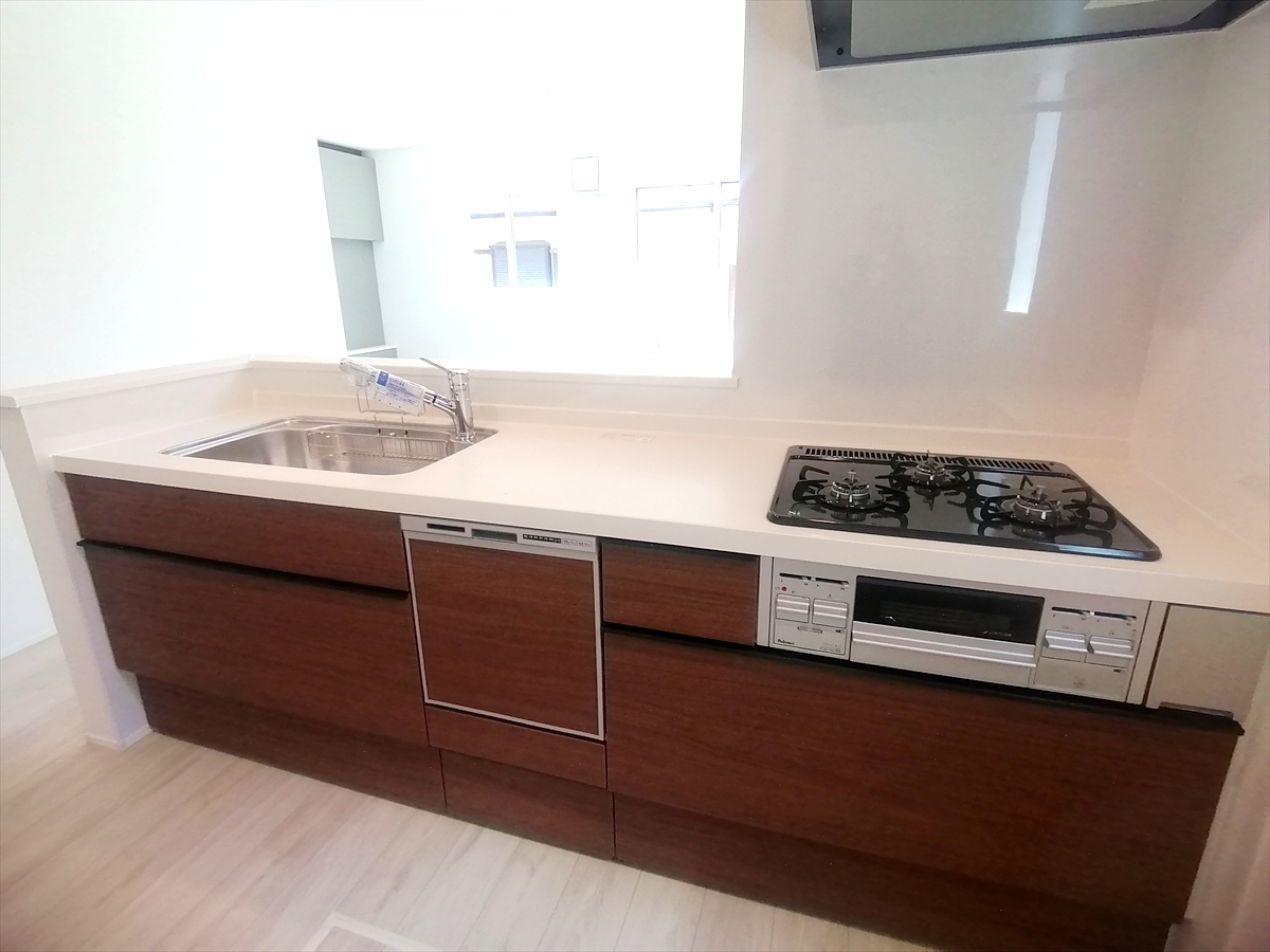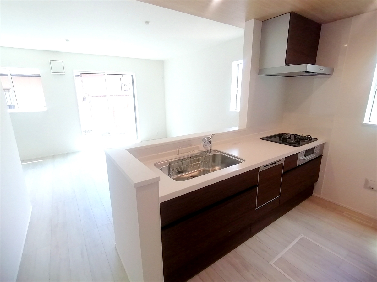 汚れ、キズ、衝撃、熱に強く清潔感のある人造大理石TOPのカウンターキッチンを採用。隙間の無いなめらか一体型シンクなのでお手入れも簡単。食器洗浄乾燥機、浄水器内蔵シャワー水栓採用■日野市多摩平3 新築一戸建て■