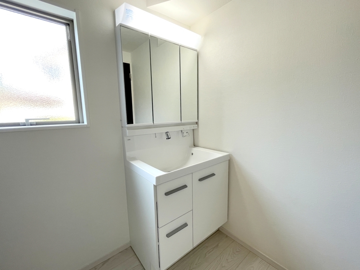 大きな三面鏡がついた洗面化粧台。鏡の裏にも収納があり洗面台がすっきりと片付きます。朝の身支度にも大変便利です■八王子市館町 新築一戸建て■