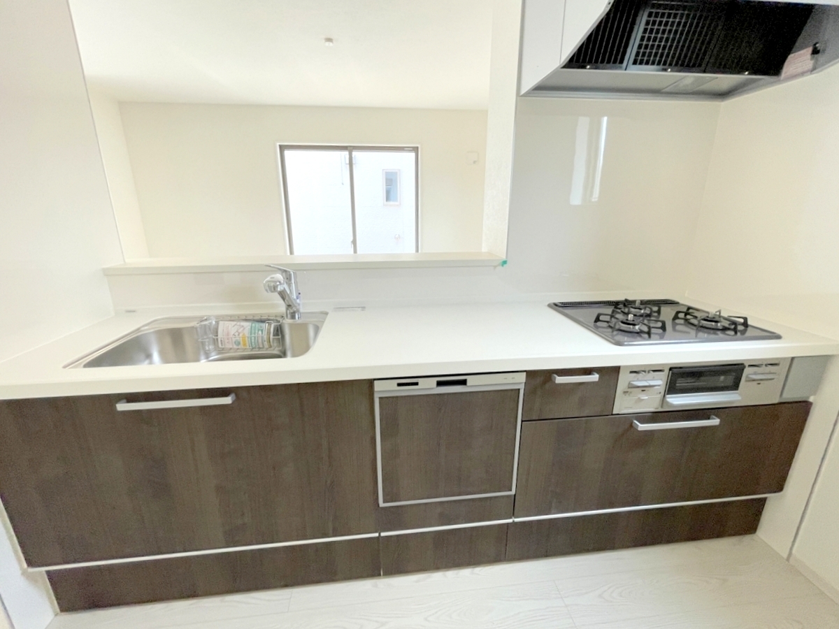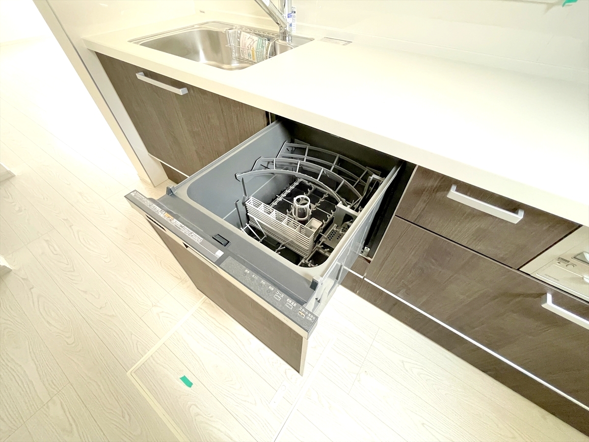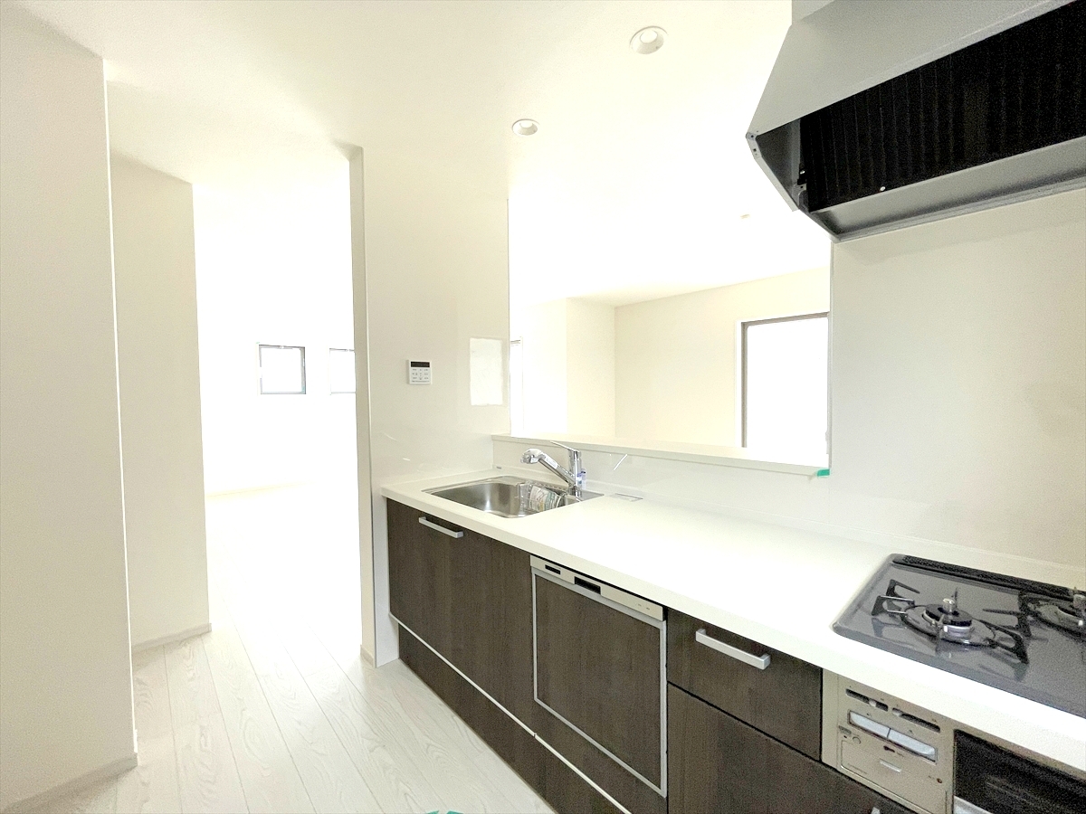 食器洗浄乾燥機、ビルトイン浄水器が装備された対面式カウンターキッチン。リビングが見渡せる設計は、小さなお子様がいるご家庭でも料理をしながら様子が伺える安心設計■八王子市館町 新築一戸建て■