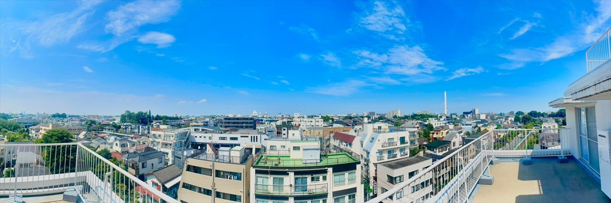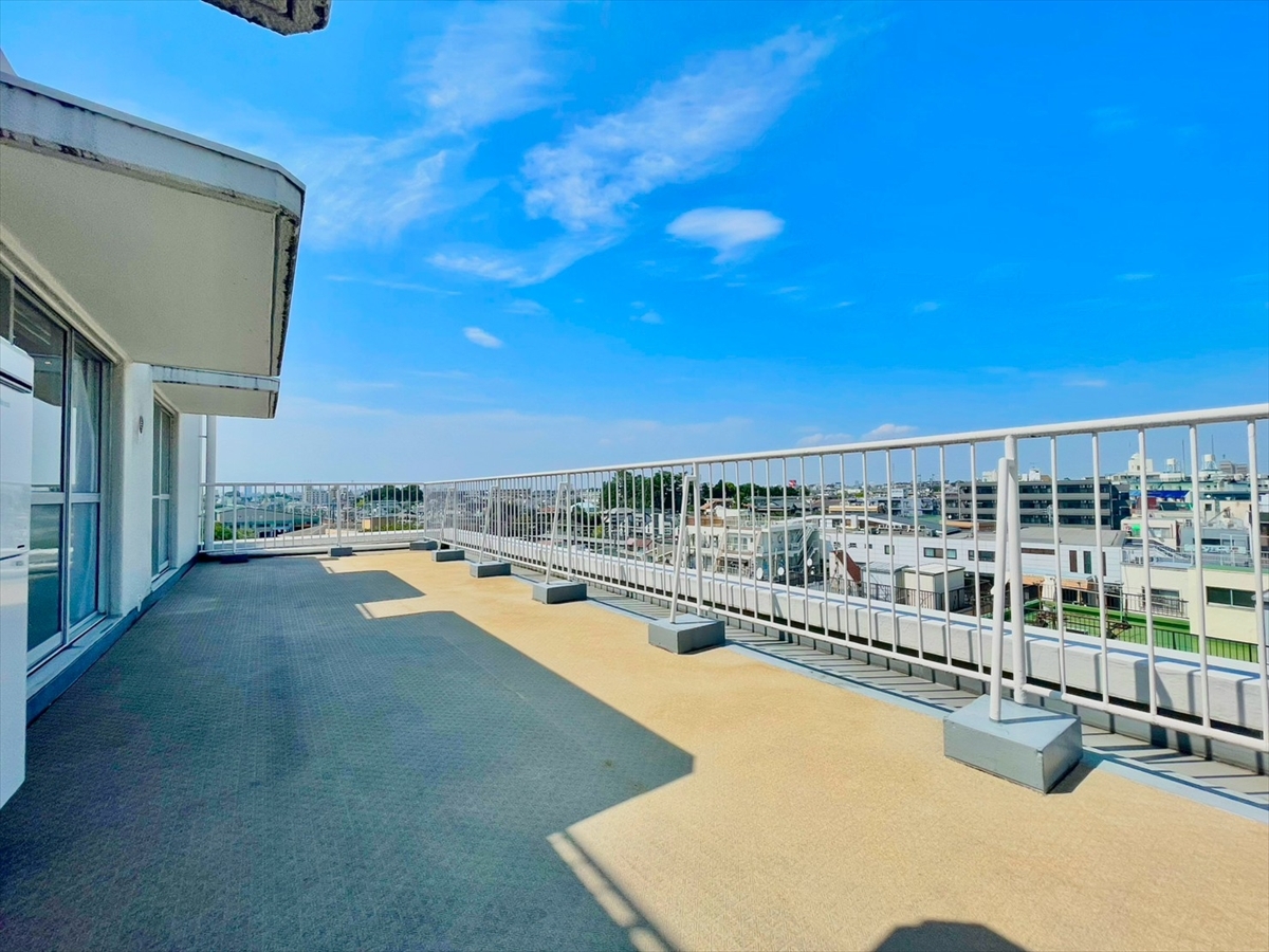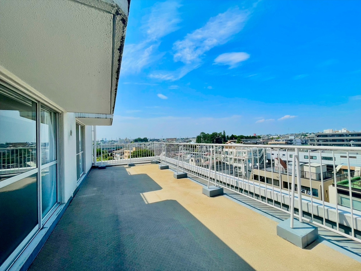 開放的な大型ルーフバルコニー。遮蔽物が一切ないパノラマ眺望。日除け軒下もあり、駅チカながらゆったりとした時間が過ごせる角住戸バルコニー魅力を感じれる環境です■杉並区久我山2 マンション■