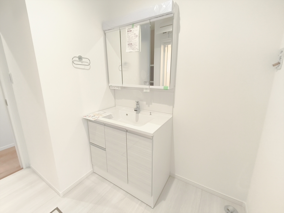 清潔なパウダールームは身だしなみチェックや肌のお手入れに最適です。収納もあり、スッキリと見映えの良い空間に拵えました。時間に余裕とゆとりを持たせます。 ■立川市柴崎町5 新築一戸建て■