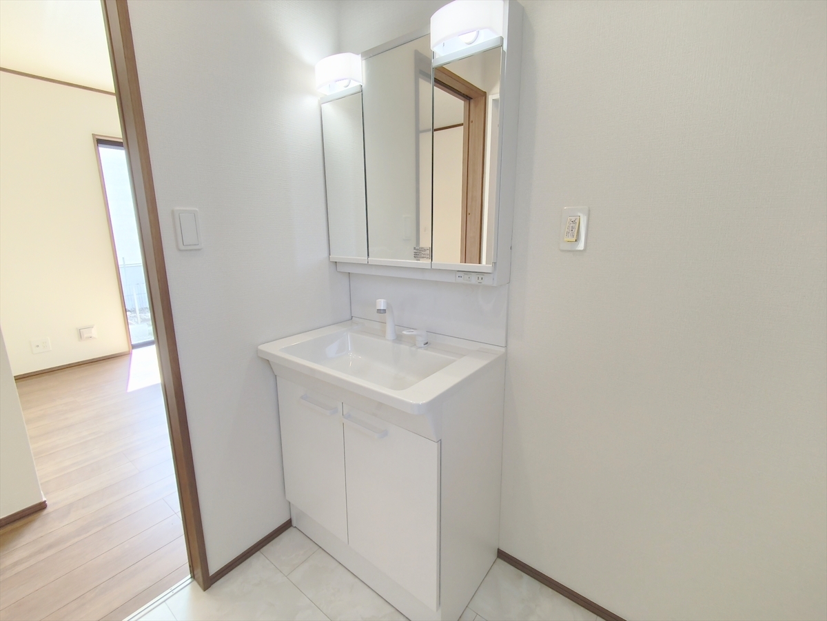 大きな三面鏡がついた洗面化粧台。鏡の裏にも収納があり洗面台がすっきりと片付きます。朝の身支度にも大変便利です。 ■日野市平山5 新築一戸建て■