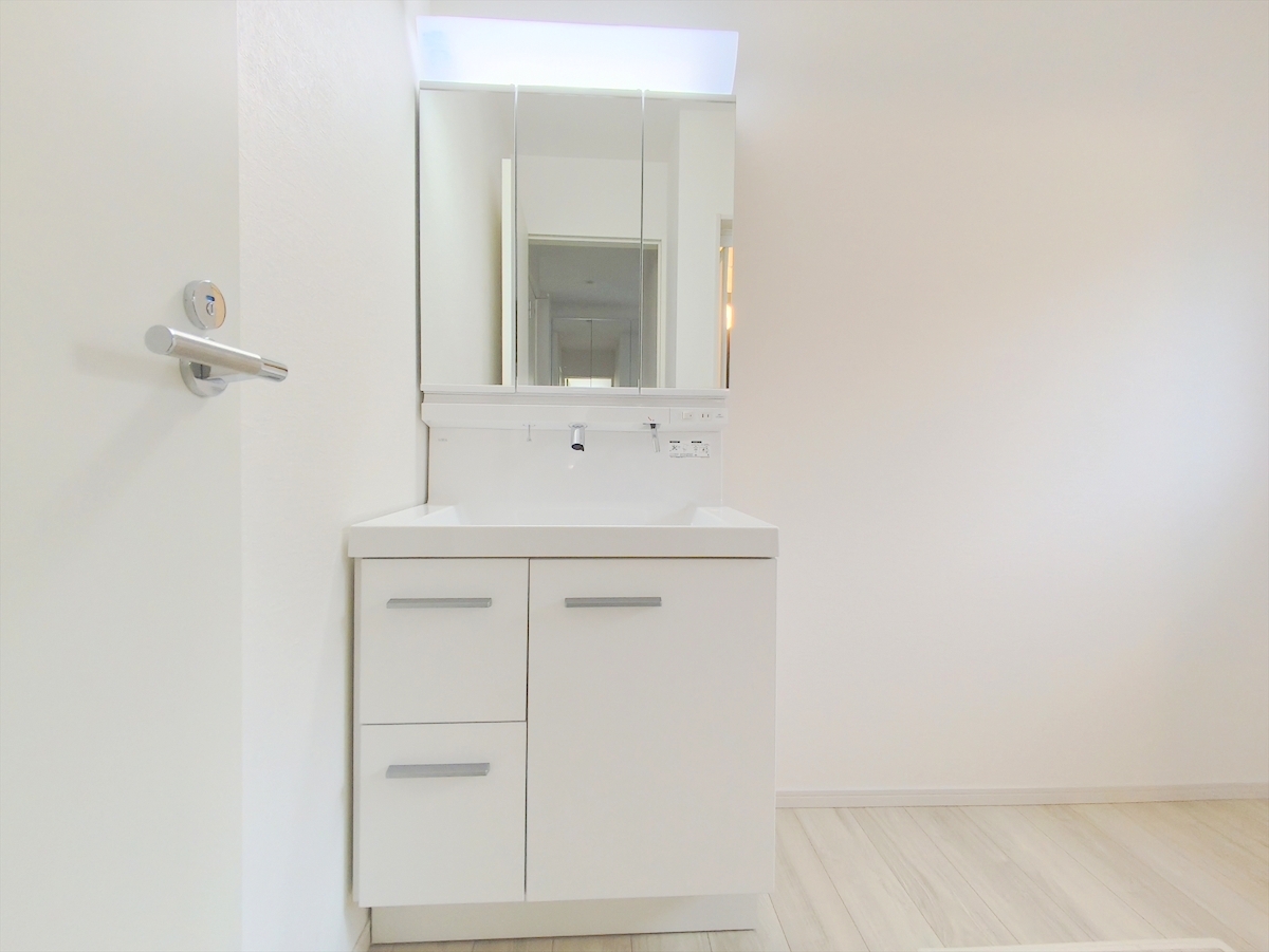 清潔なパウダールームは身だしなみチェックや肌のお手入れに最適です。収納もあり、スッキリと見映えの良い空間に拵えました。時間に余裕とゆとりを持たせます。 ■府中市浅間町4 新築一戸建て■