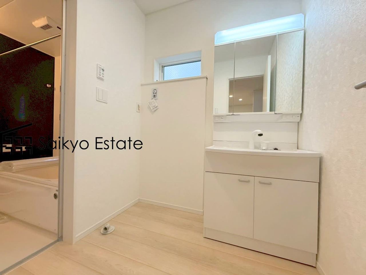 【施工例】女性にはうれしいシャンプードレッサー付きの三面鏡洗面化粧台。収納スペースも十分ございますので、ドライヤーなどすっきりと片付きます♪