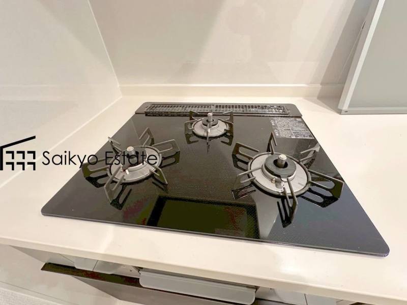【施工例】「3口ガスコンロシステム」はたくさんの料理が同時に作れて便利な上、凹凸が少ないフラットトップなのでお掃除も楽々です。