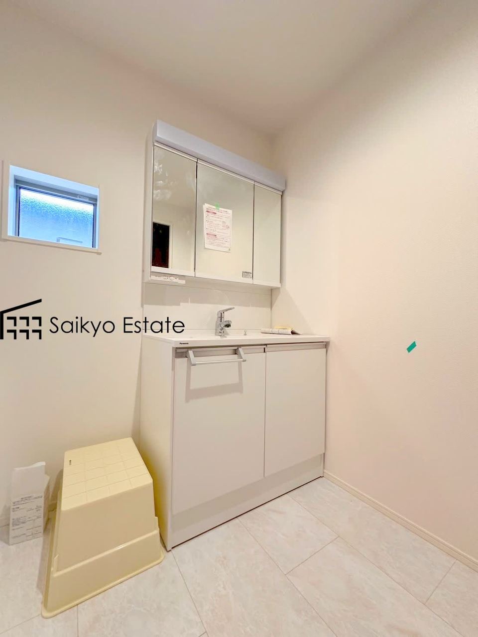 【施工例】三面鏡付きの洗面化粧台を完備。収納スペースも十分ございますので、ドライヤーなどすっきりと片付きます♪