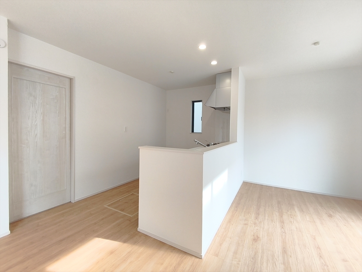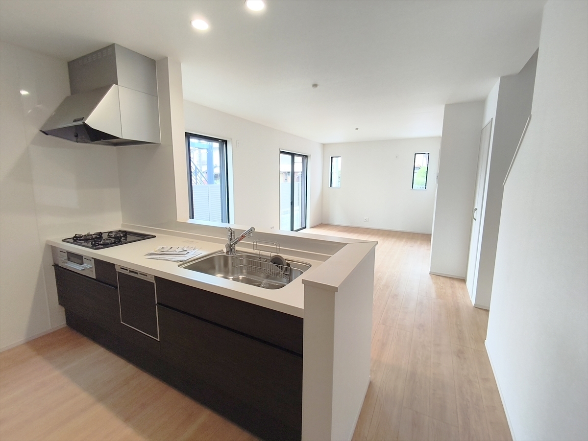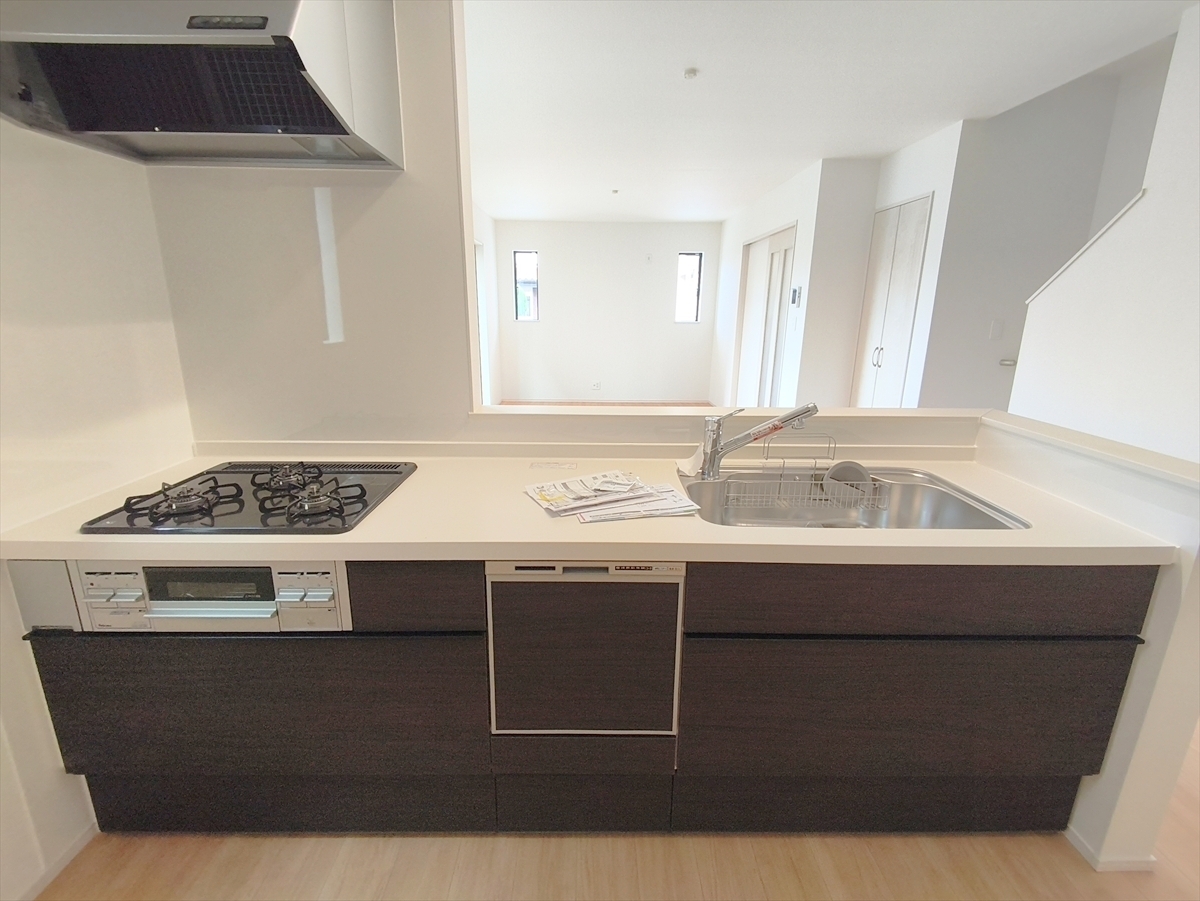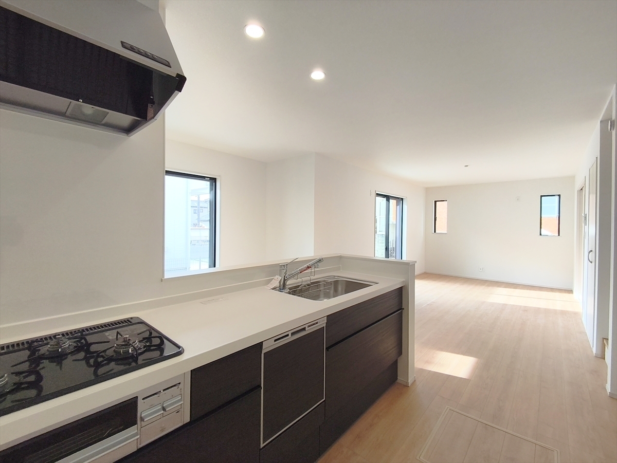 キッチンに立った位置から、リビングにいる家族に目線が届く見守りキッチン! ■立川市幸町4 新築一戸建■