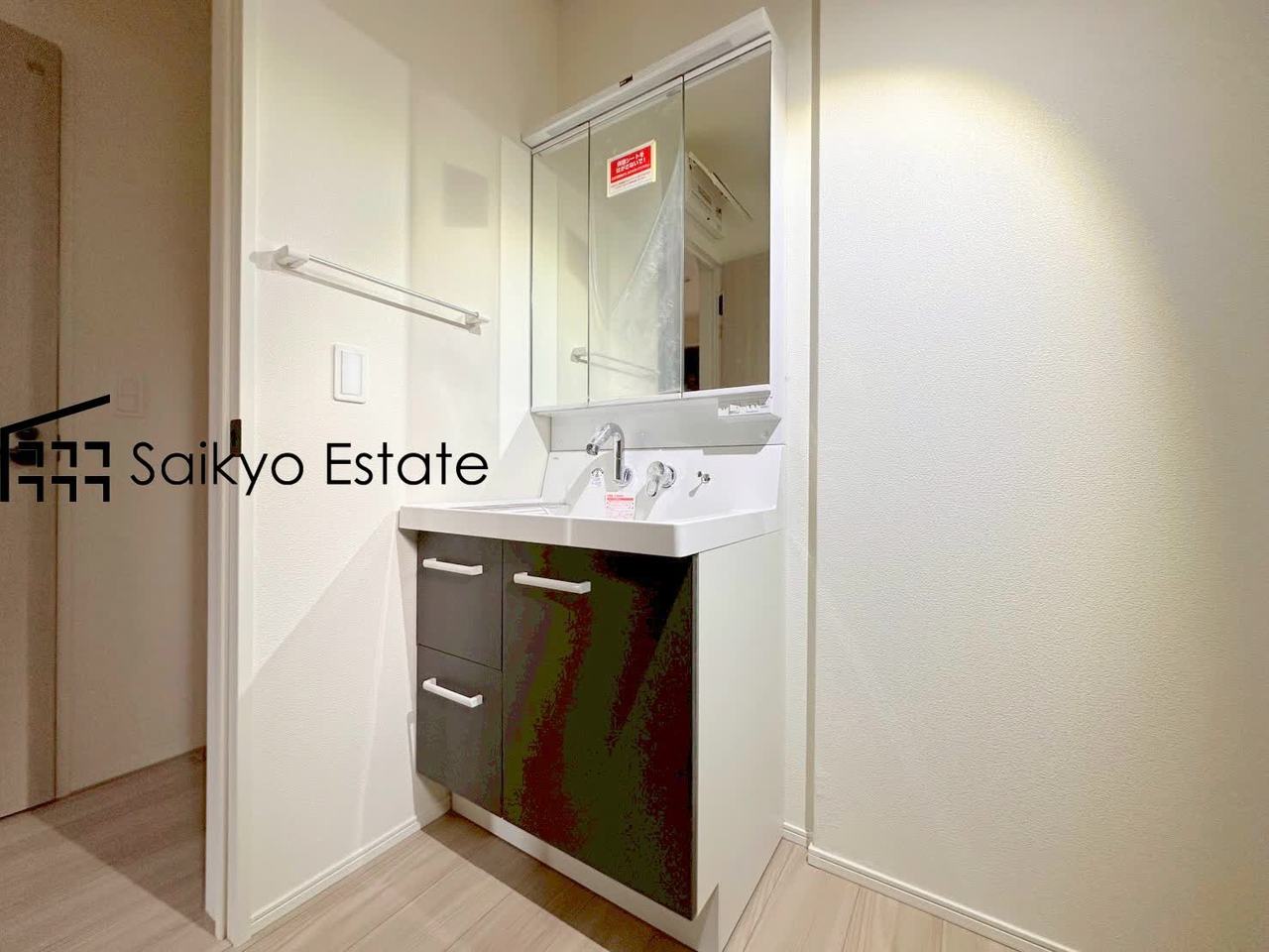 三面鏡付きの洗面化粧台を完備。収納スペースも十分ございますので、ドライヤーなどすっきりと片付きます♪