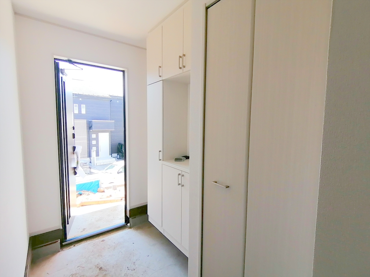 玄関は清潔感のある空間にしたいもの。ご家族が多いご家庭にはとても便利なたっぷり収納できるシューズボックス付きです。 ■昭島市中神町2 新築一戸建て■