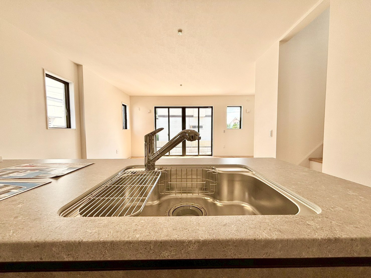汚れ、キズ、衝撃、熱に強く清潔感のある人造大理石TOPのカウンターキッチンを採用。隙間の無いなめらか一体型シンクなのでお手入れも簡単。食器洗浄乾燥機、浄水器内蔵シャワー水栓採用 ■府中市北山町2 新築一戸建て■