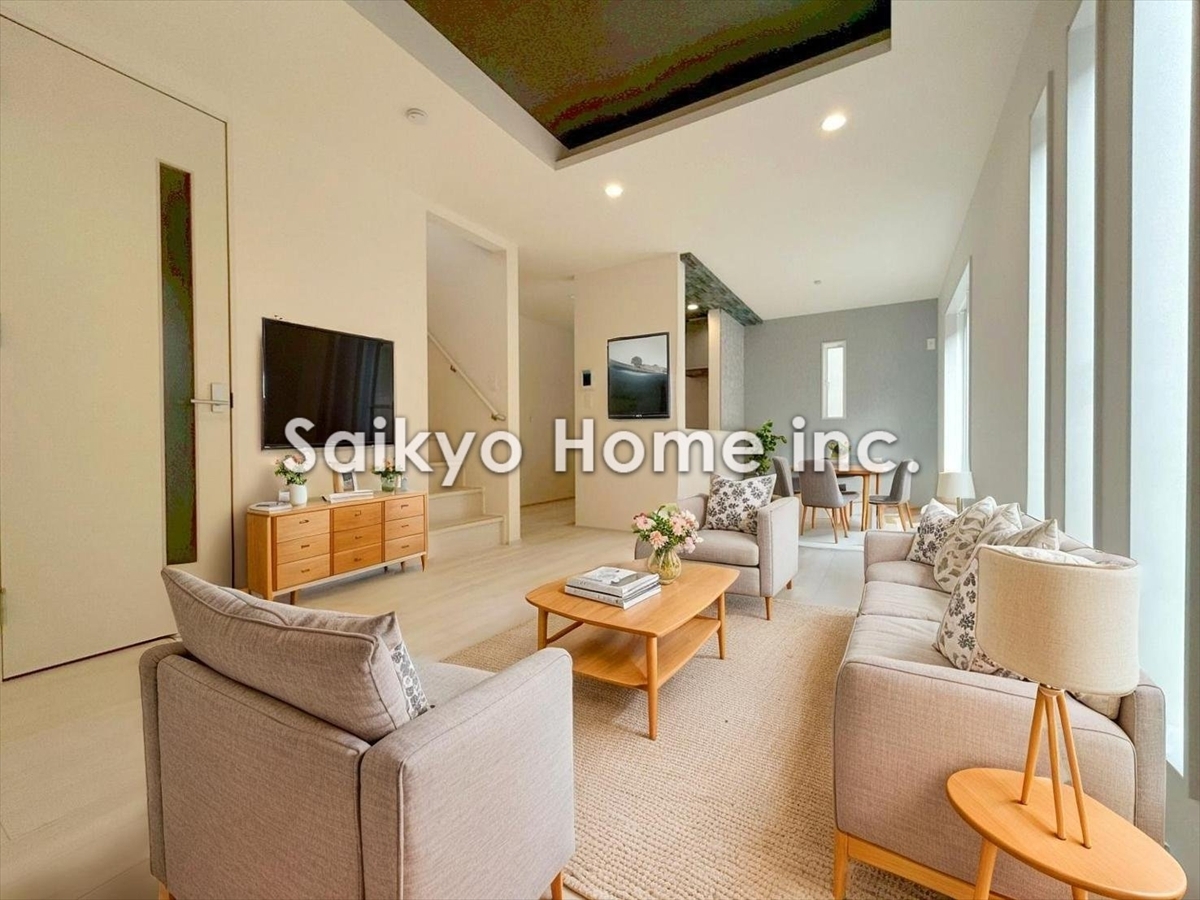 家族が集うLDKは、キッチン・ダイニング・リビングが一つの空間になった間取り。大きな窓から明るさを確保。※家具等はCG加工しております。■府中市四谷4 新築一戸建て■