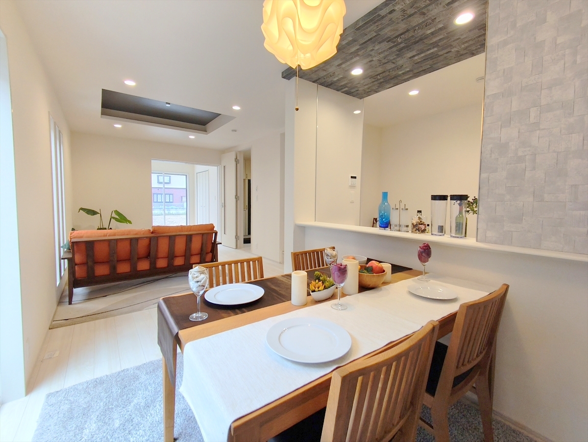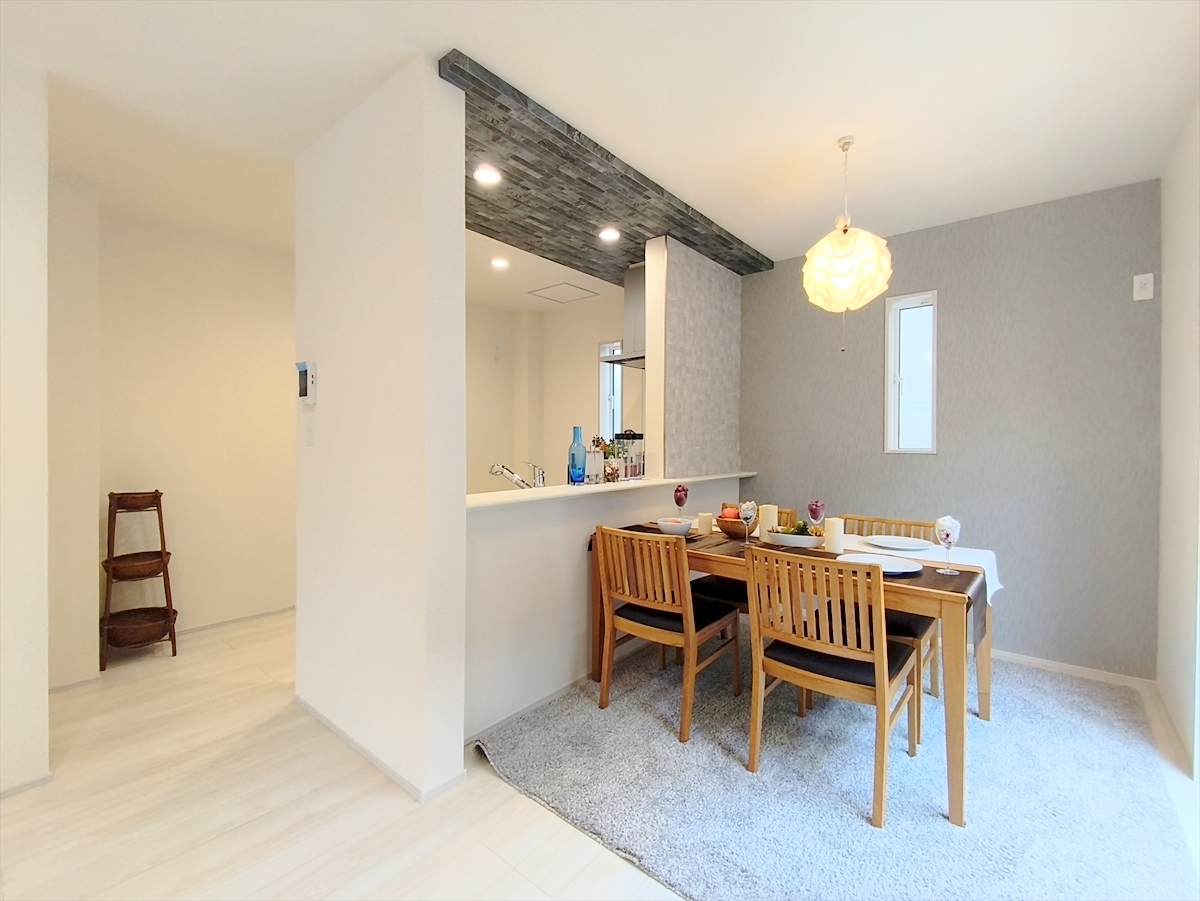 アクセントクロスがおしゃれなLDKでくつろぎの時間をお過ごしください。※家具等はCG加工しております。■府中市四谷4 新築一戸建て■