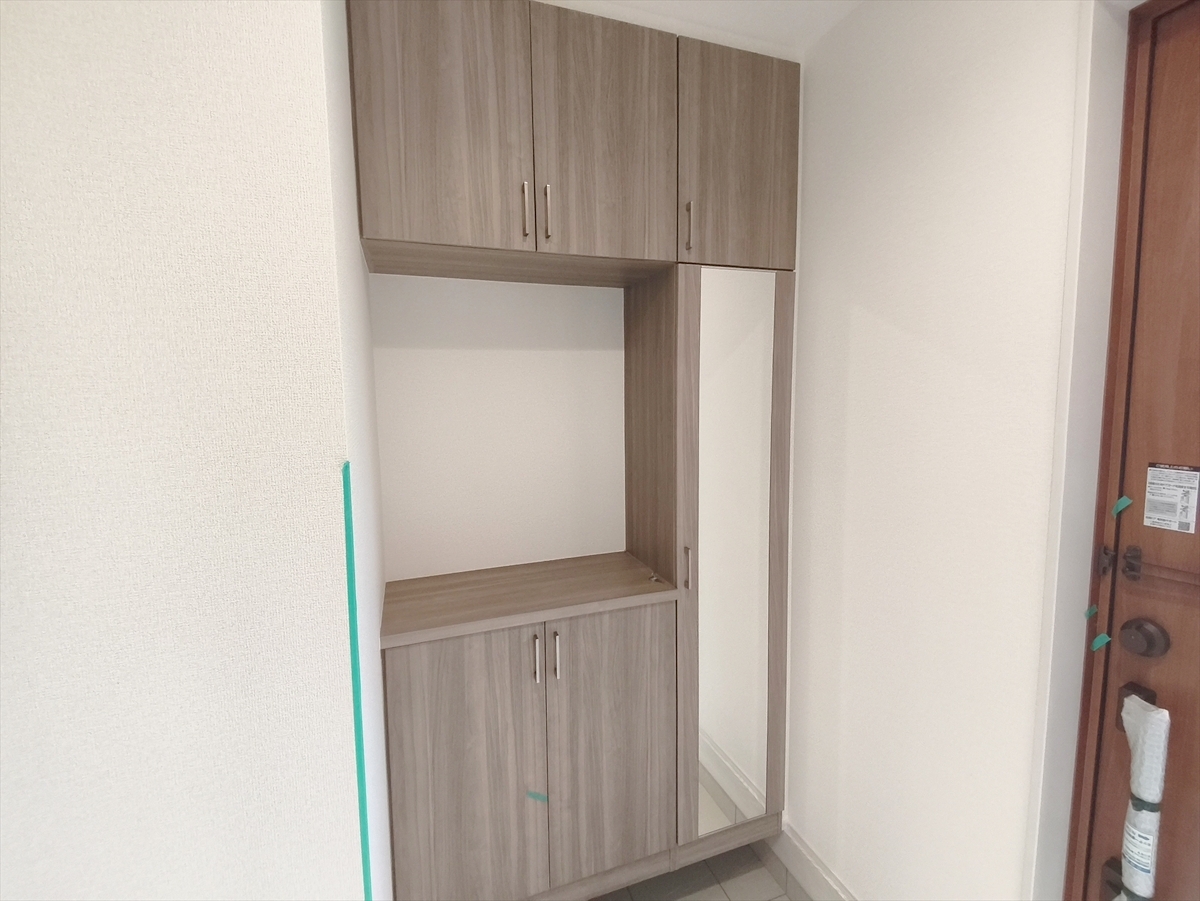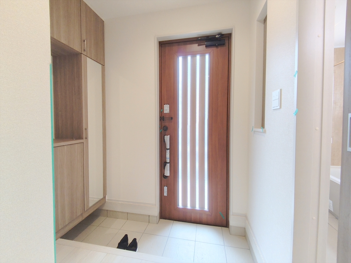 お出かけ前の身だしなみチェックが出来る姿見鏡付の玄関収納。かさばる物も収納できる優れものです。■府中市四谷4 新築一戸建て■