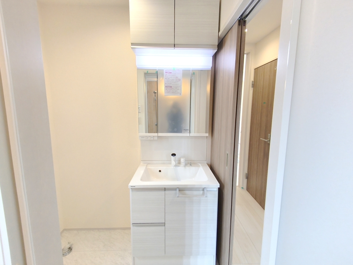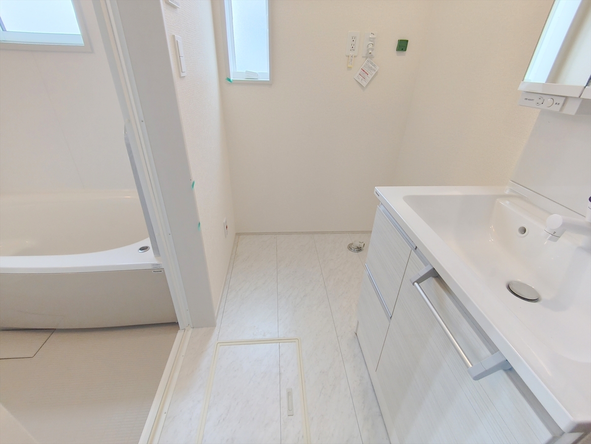 大きな三面鏡がついた洗面化粧台。鏡の裏にも収納があり洗面台がすっきりと片付きます。朝の身支度にも大変便利です。■府中市四谷4 新築一戸建て■