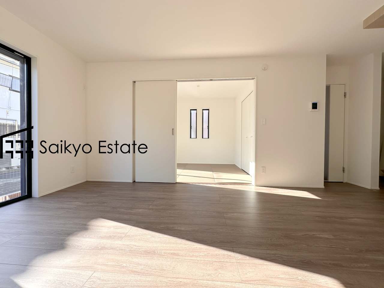 【施工例】リビング横の4.5帖の和室の引戸を開放して広々とした空間としてご使用いただけます。お子様が自由にのびのびと遊べます♪