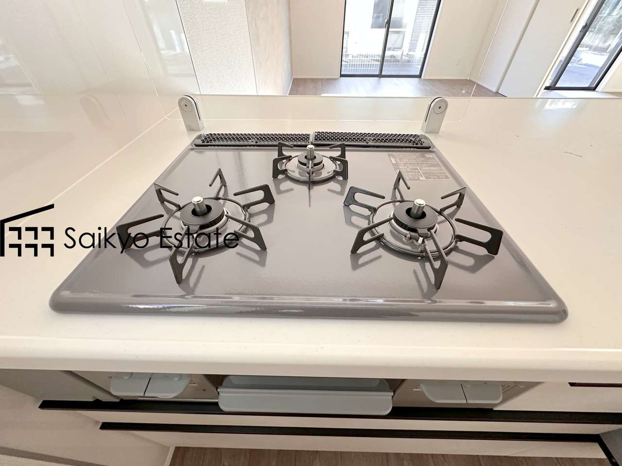 【施工例】「3口ガスコンロシステム」はたくさんの料理が同時に作れて便利な上、凹凸が少ないフラットトップなのでお掃除も楽々です。