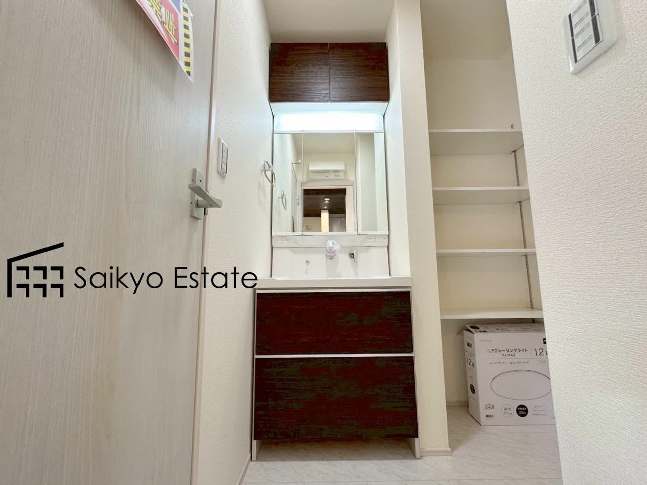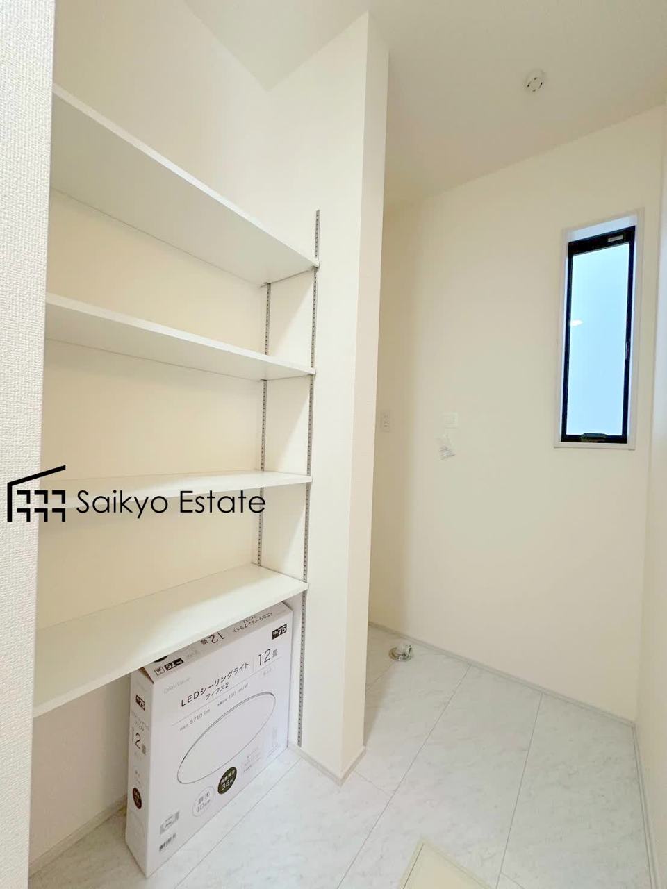洗面室には棚付きの収納スペースがございますので、リネン庫としてお使いいただけます。