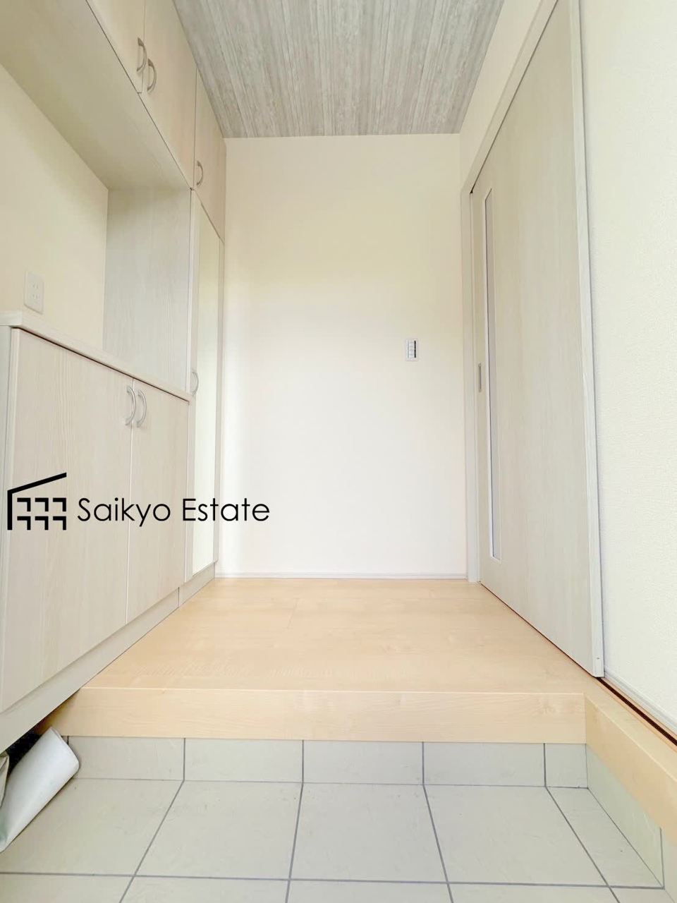 白を基調とした清潔感のある玄関。全身を映せる姿見でお出かけ前の身だしなみのチェックもバッチリです!