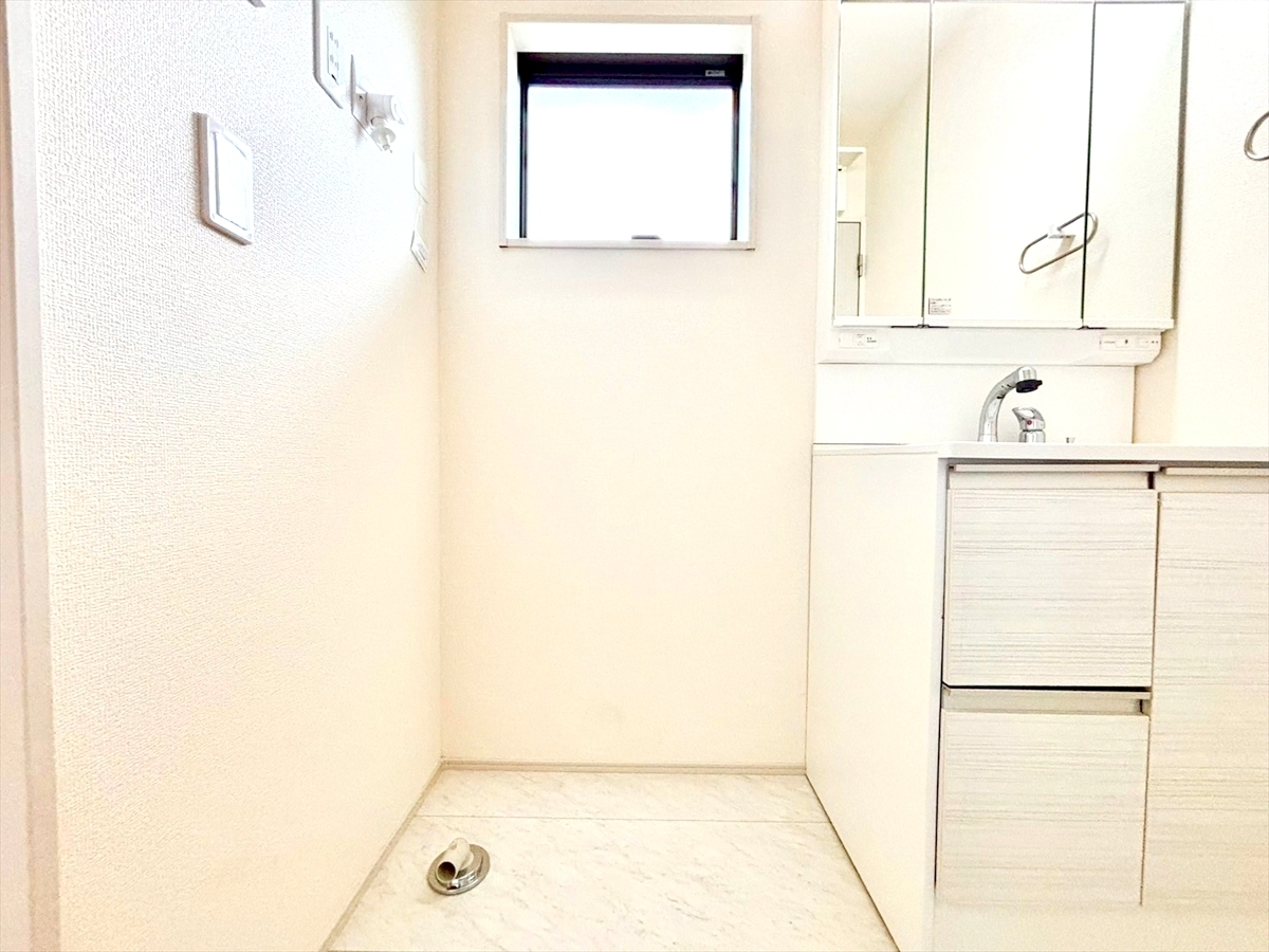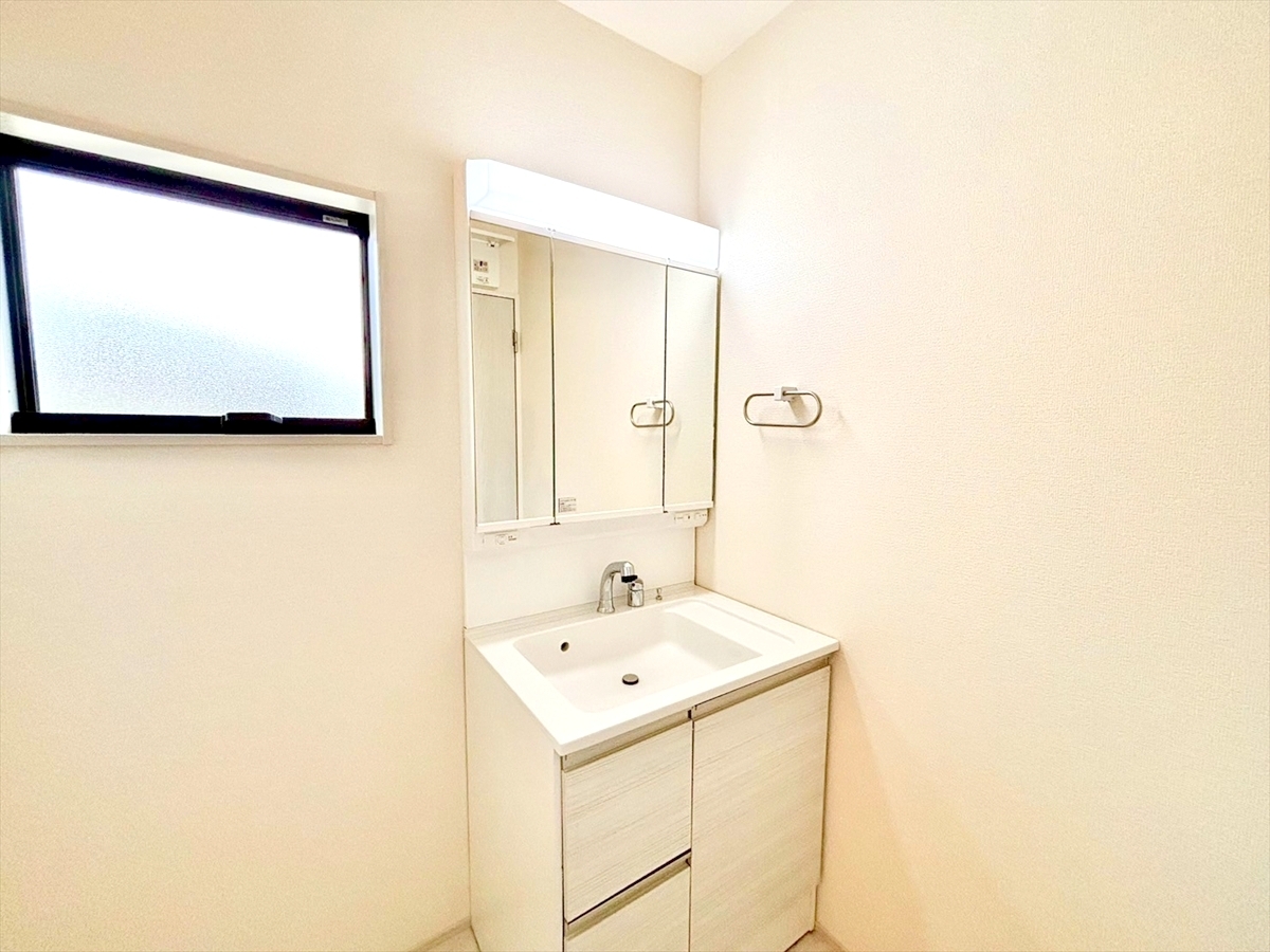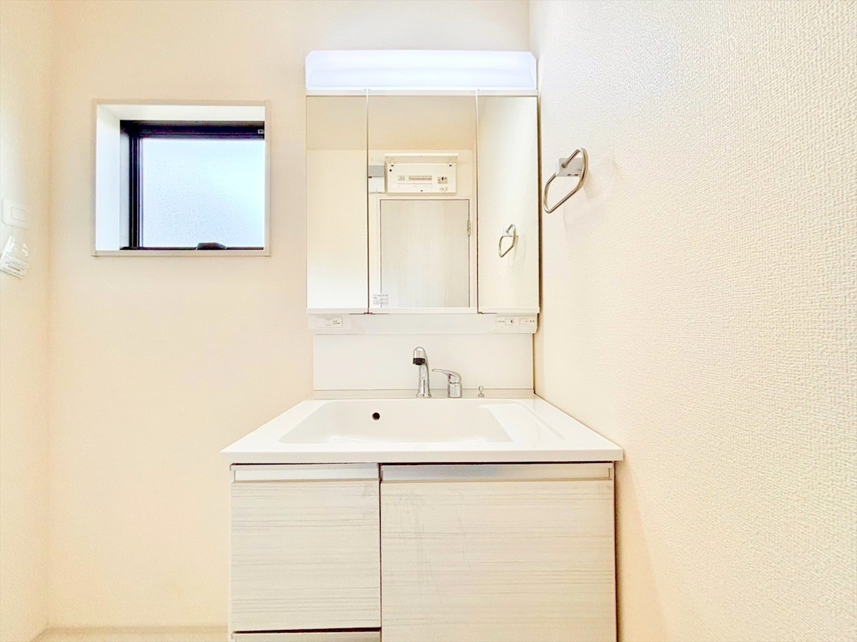 大きな三面鏡がついた洗面化粧台。鏡の裏にも収納があり洗面台がすっきりと片付きます。朝の身支度にも大変便利です。■府中市若松町3丁目 新築戸建て■