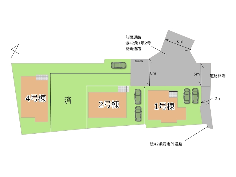 | 接道 | 北側6M道路に接道 東側2M道路に接道 |