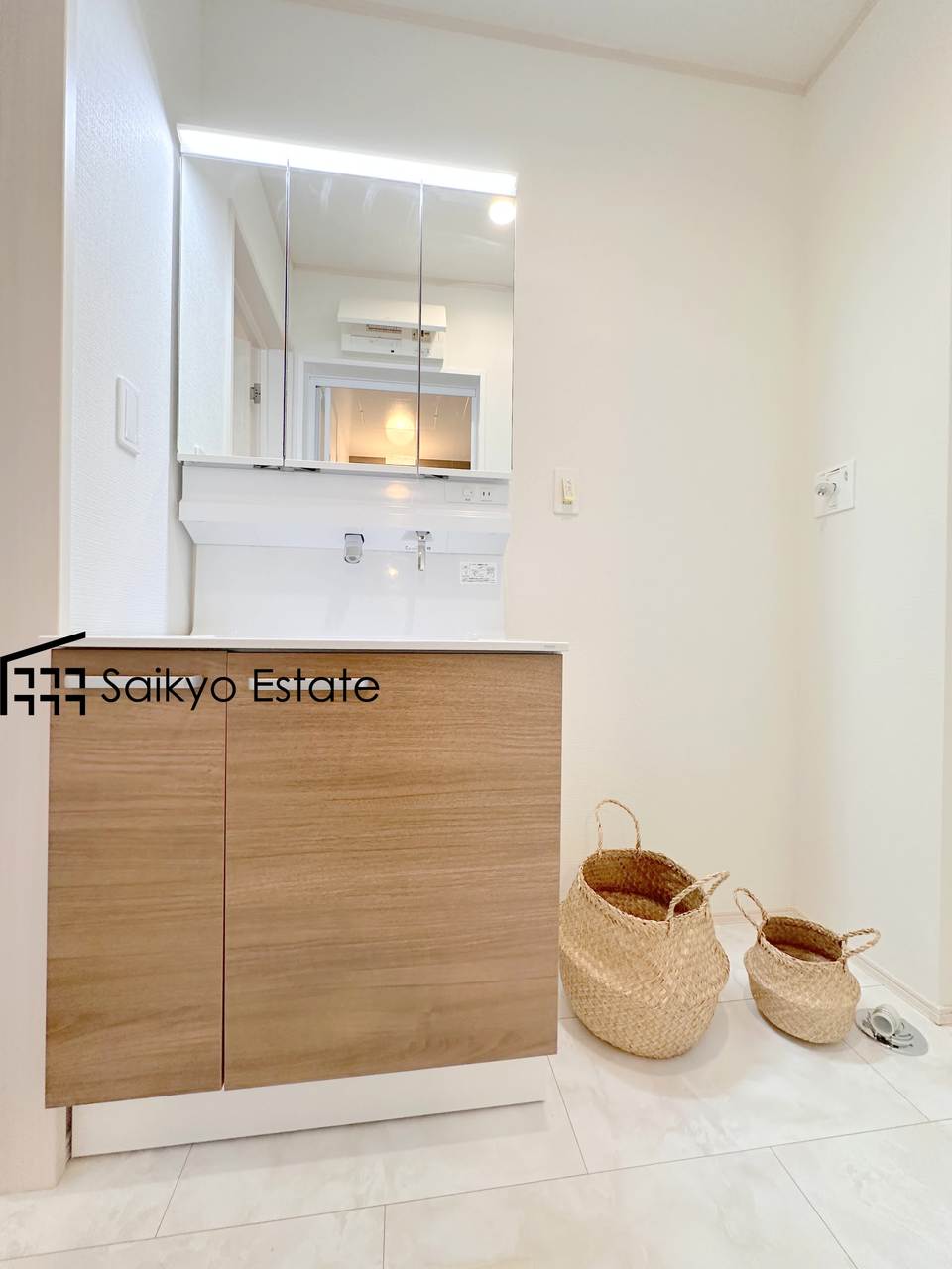 女性にはうれしいシャンプードレッサー付きの三面鏡洗面化粧台。収納スペースも十分ございますので、ドライヤーなどすっきりと片付きます♪