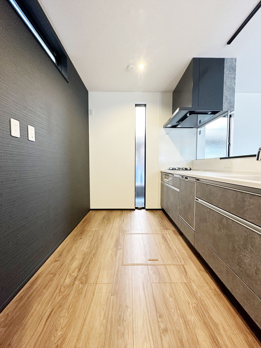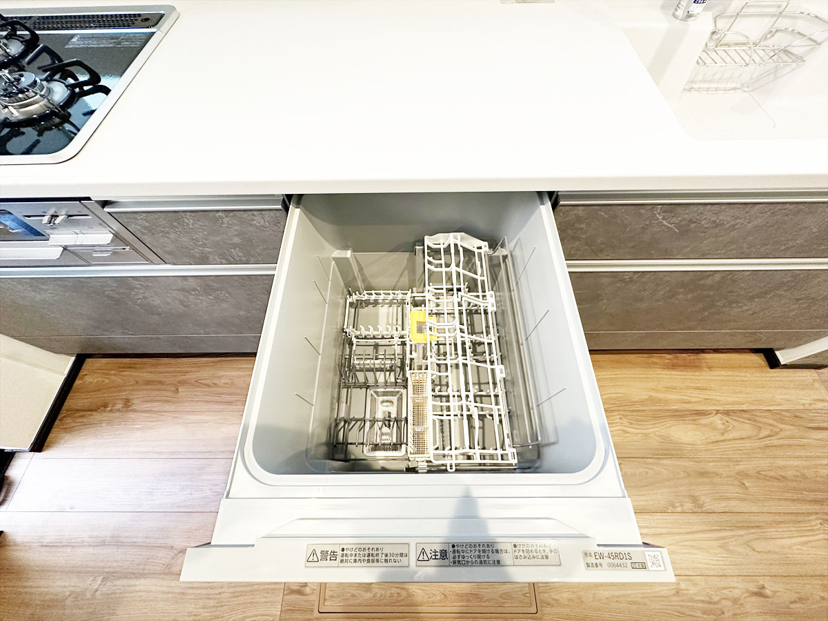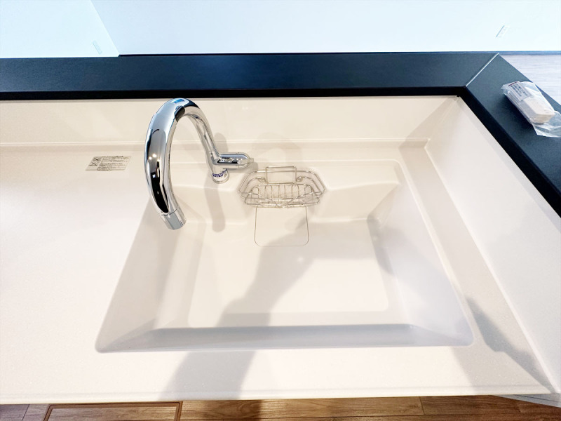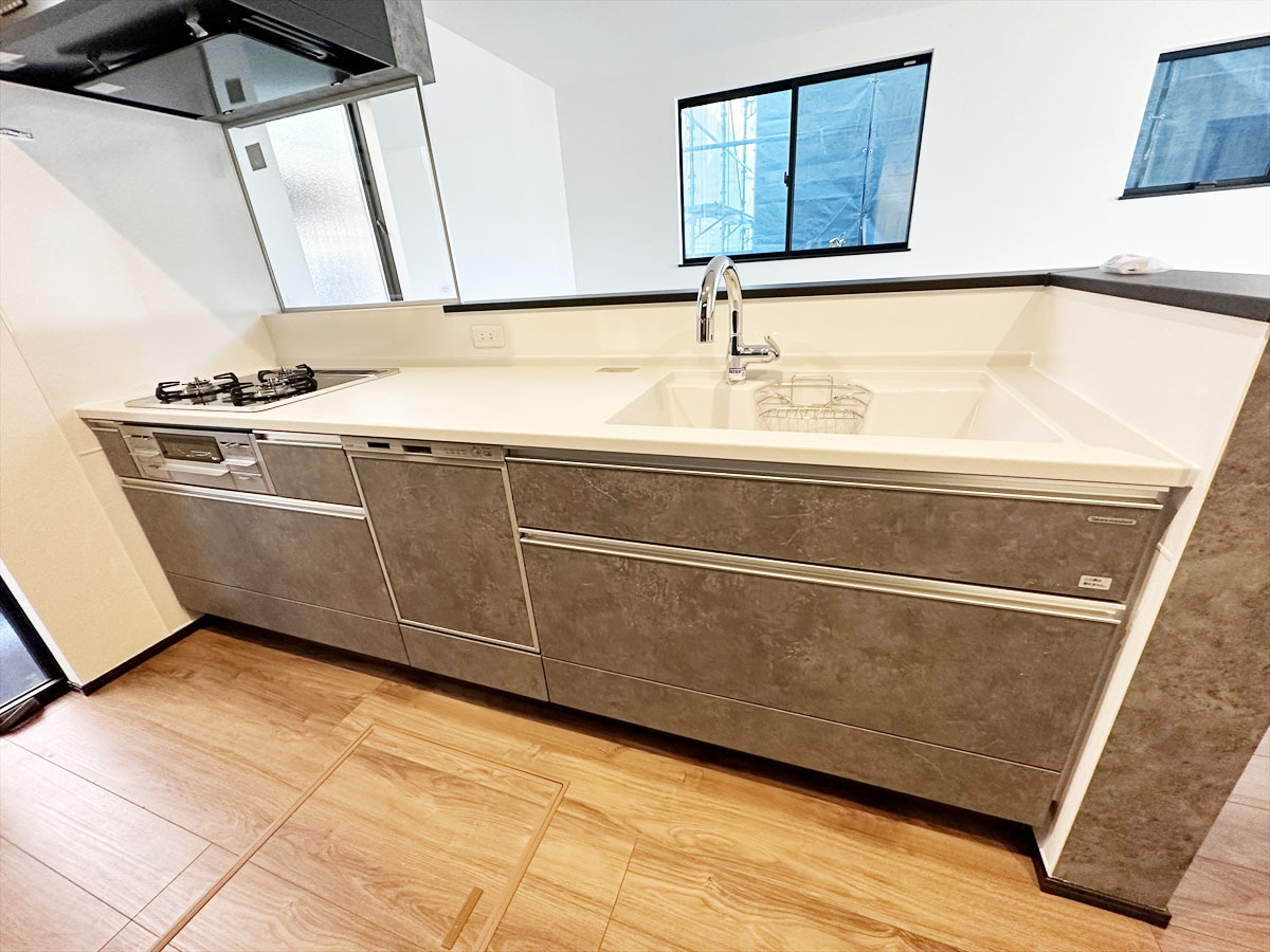 食洗機設置のシステムキッチン。人造大理石トップは、パン作りやお菓子作りの際もそのまま調理台として使用できます。お子様と一緒にホームメイドはいかがですか?■三鷹市北野2 新築一戸建て■