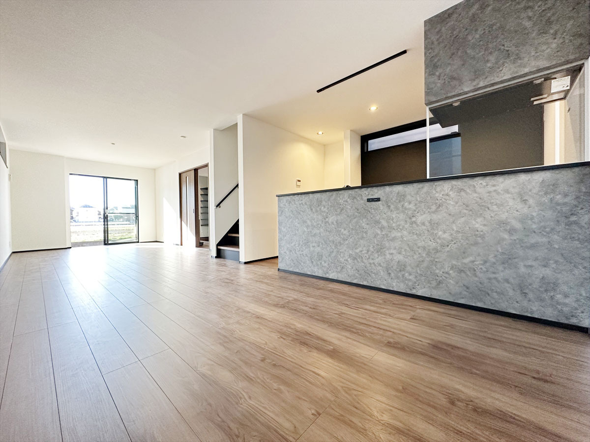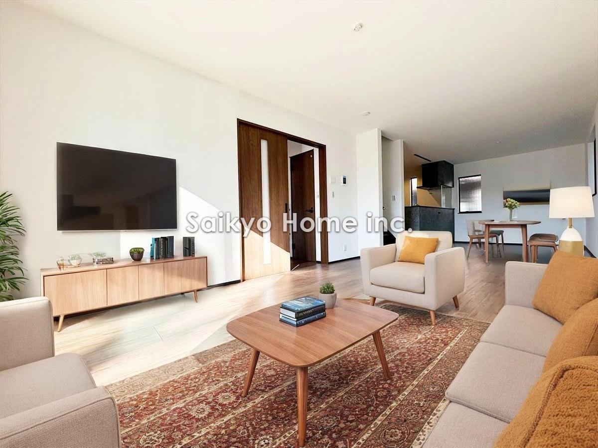 リビングを中心とした家族のコミュニケーションを作り出すリビング階段。お子様の「ただいま」の声を、顔を会わせて聞くことができます。大きな窓を配置し明るく開放感ある設計。※家具などはCG加工しております。■三鷹市北野2 新築一戸建て■