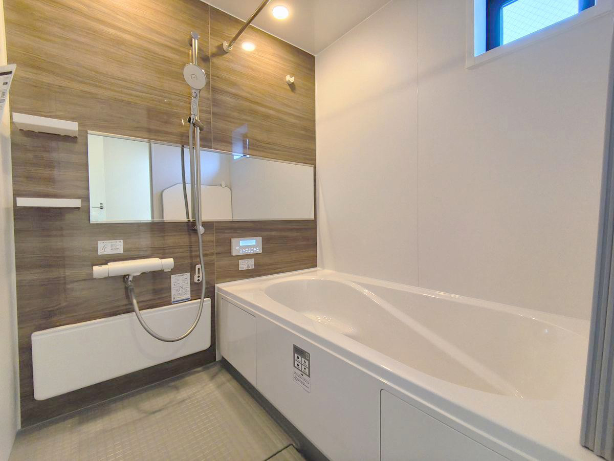 ゆったりと足を伸ばせる一坪タイプの浴室です。浴室換気乾燥機付きですので、カビの発生も抑制出来ます。 図■府中市分梅町1 新築一戸建■