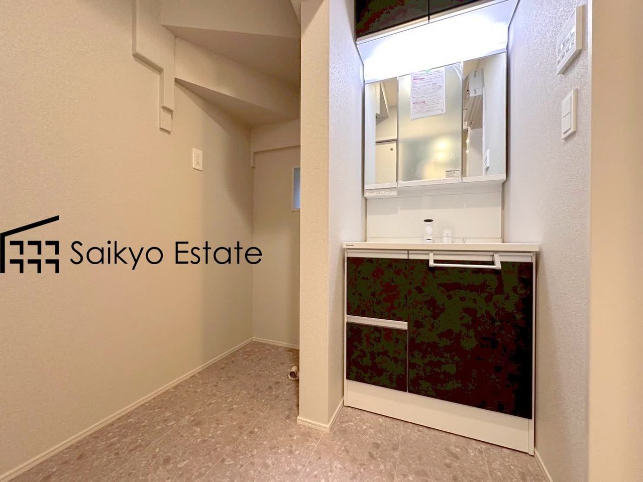 【施工例】三面鏡付きの洗面化粧台を完備。収納スペースも十分ございますので、ドライヤーなどすっきりと片付きます♪