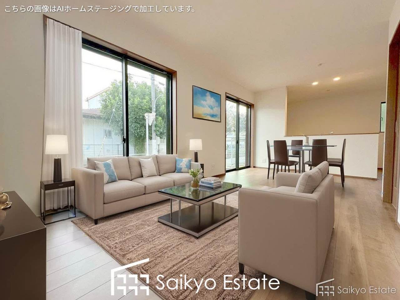 開放感と採光にこだわった15帖の広々としたLDKです。陽光いっぱいの空間で家族団らんの時間も増えそうですね!※家具類はCG加工しています。