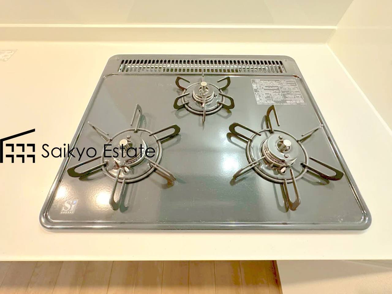 「3口ガスコンロシステム」はたくさんの料理が同時に作れて便利な上、凹凸が少ないフラットトップなのでお掃除も楽々です。
