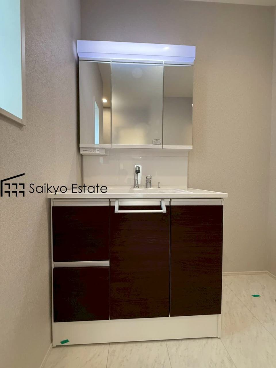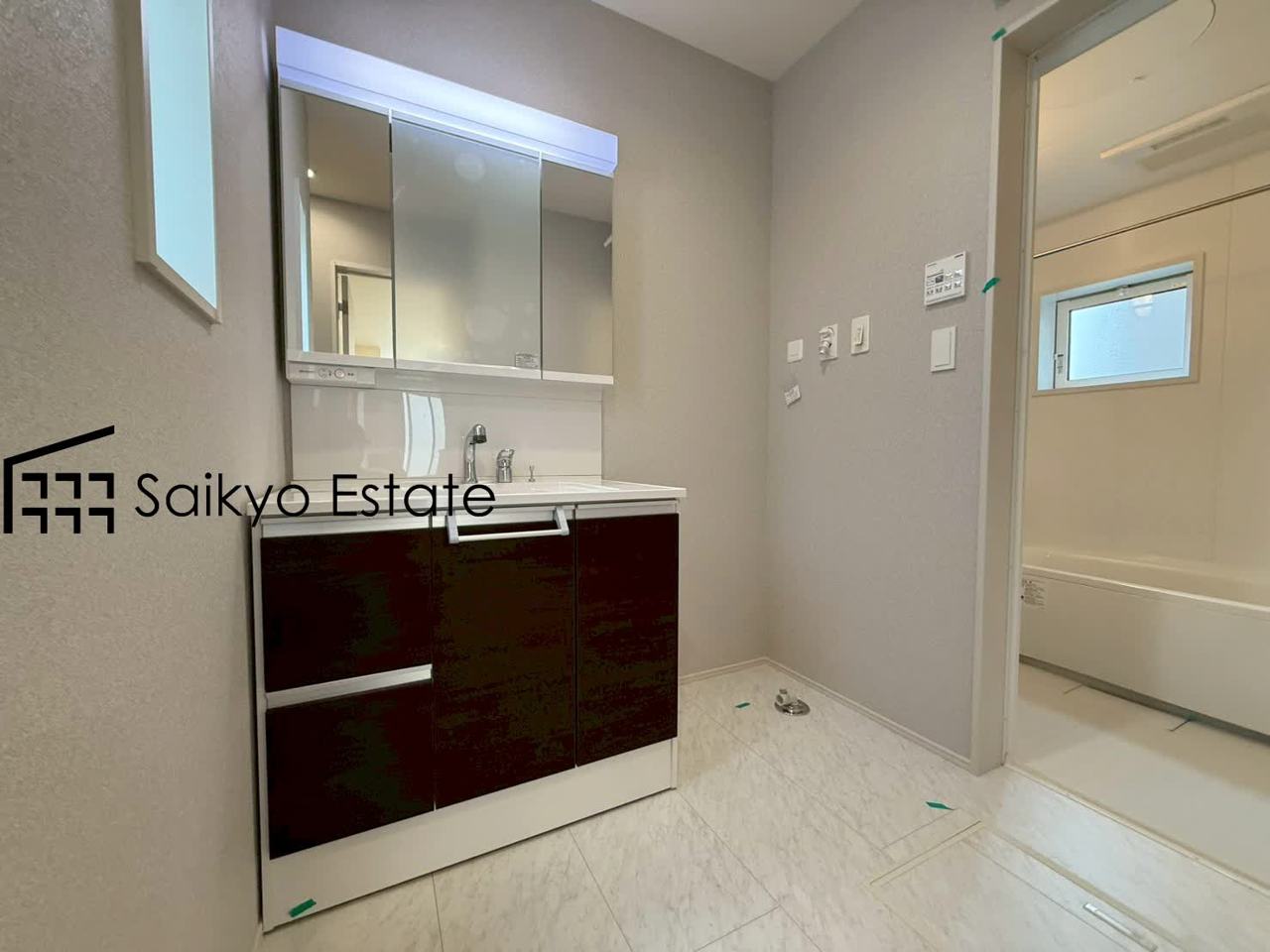 三面鏡付きの洗面化粧台を完備。収納スペースも十分ございますので、ドライヤーなどすっきりと片付きます♪