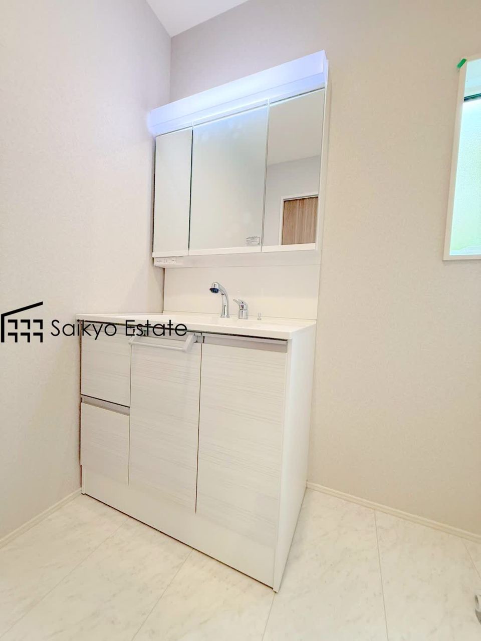 三面鏡付きの洗面化粧台を完備。収納スペースも十分ございますので、ドライヤーなどすっきりと片付きます♪