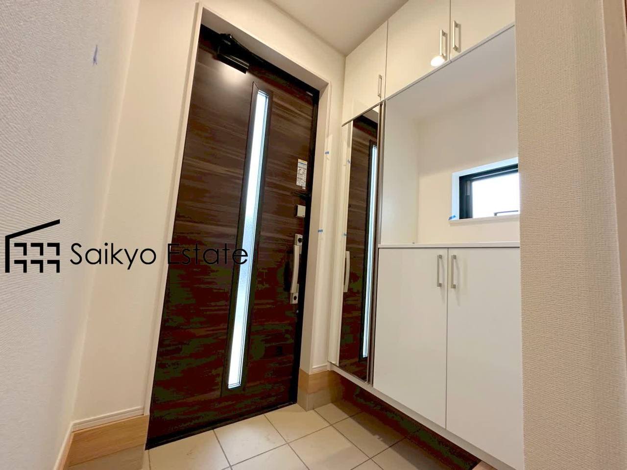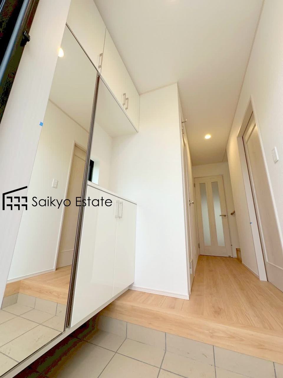 白を基調とした清潔感のある玄関。全身を映せる姿見でお出かけ前の身だしなみのチェックもバッチリです!