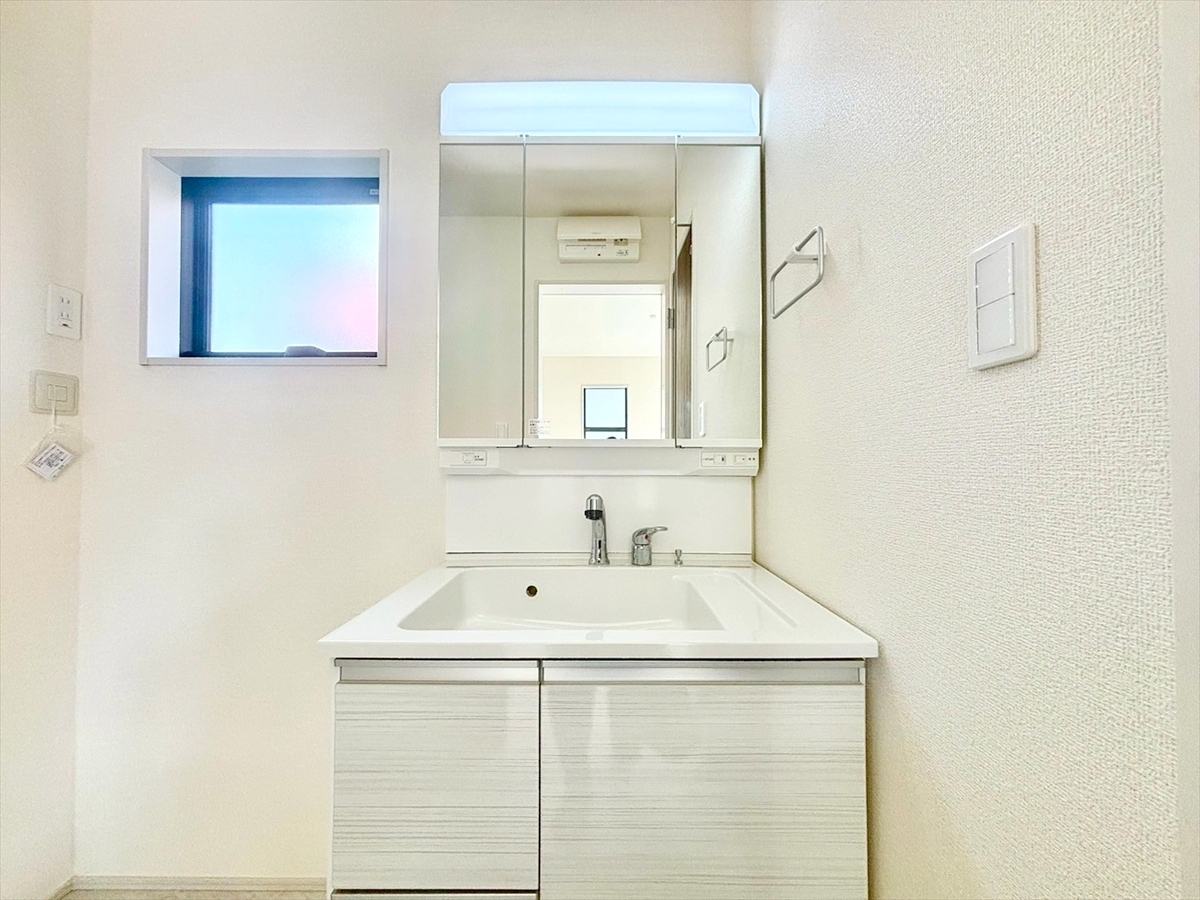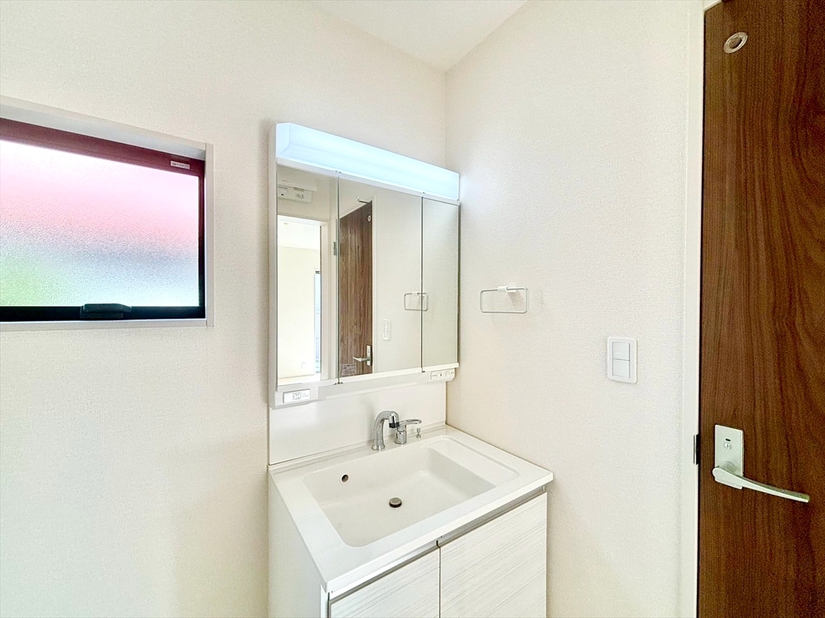 洗面台には三面鏡を採用。身だしなみを整えやすい事はもちろんですが、鏡の後ろに収納スペースを設ける事により、散らかりやすい洗面スペースをすっきりさせる事が出来るのも嬉しいですね。■府中市白糸台3 新築一戸建て■