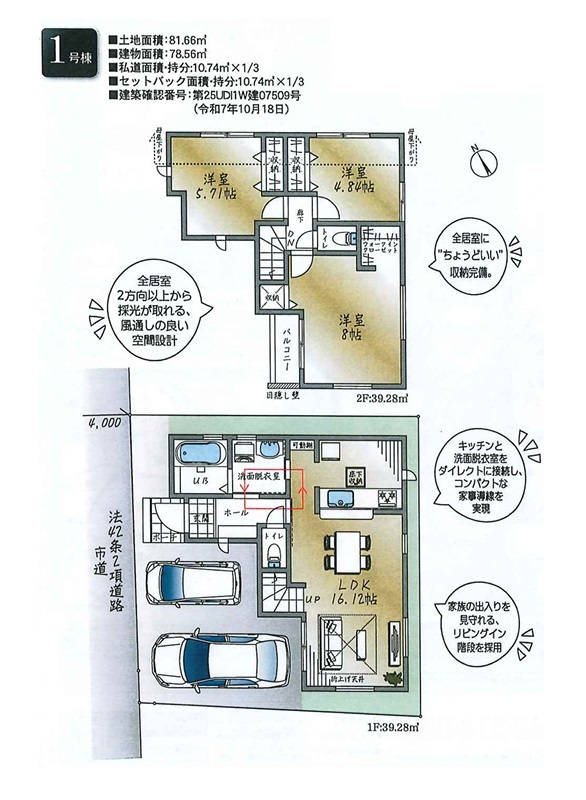 | 土地面積 | 81.68m² (私道10.74m²別に有、私道持分比率:1/3、セットバック3.58m²) | ||