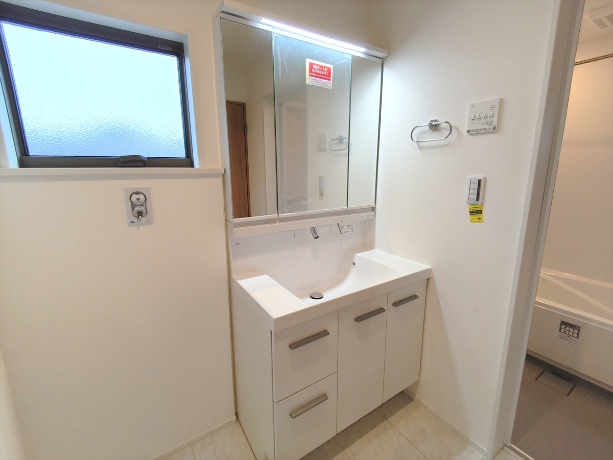 大きな三面鏡がついた洗面化粧台。鏡の裏にも収納があり洗面台がすっきりと片付きます。朝の身支度にも大変便利です。■国分寺市高木町1丁目 新築戸建て■