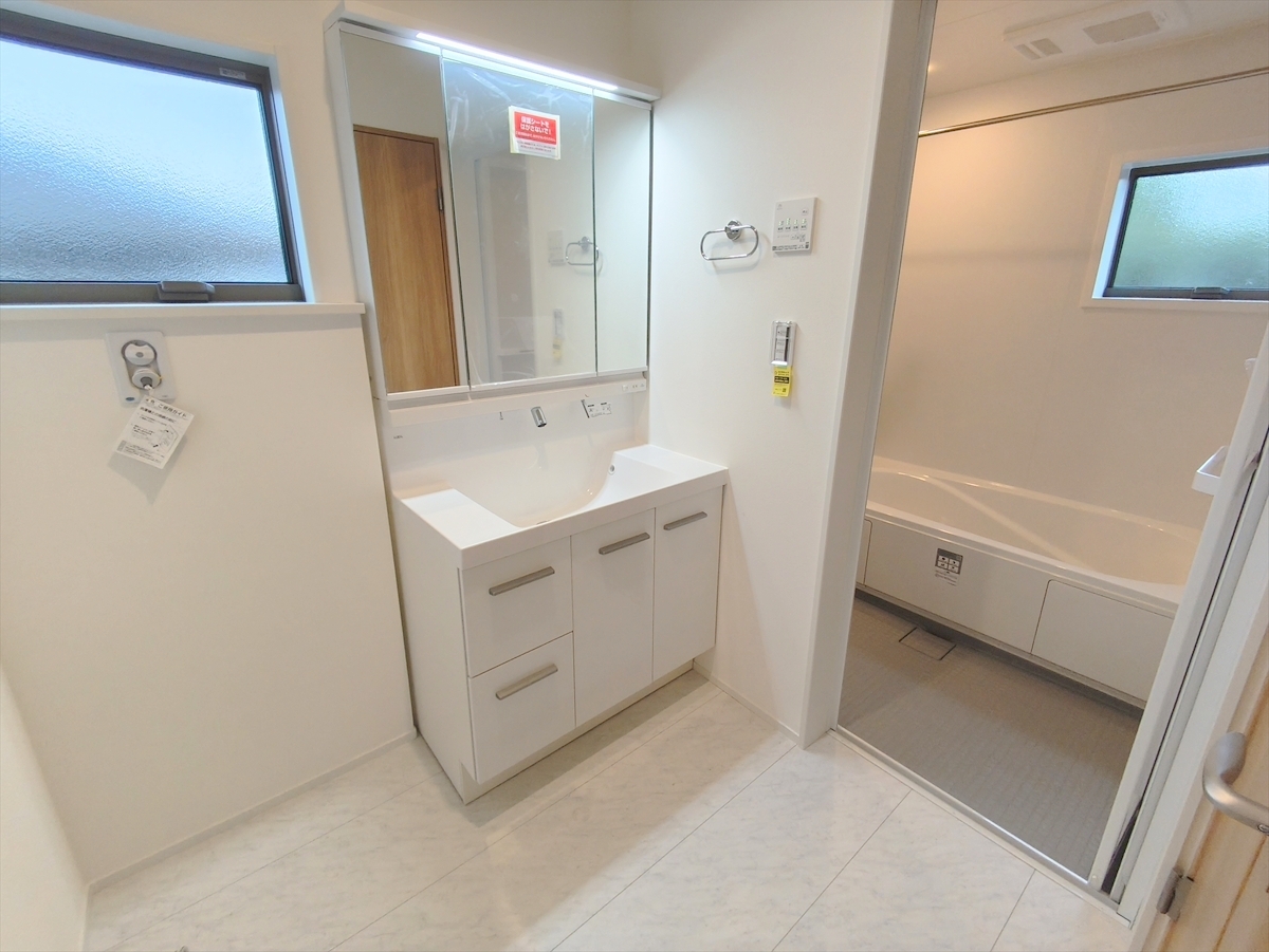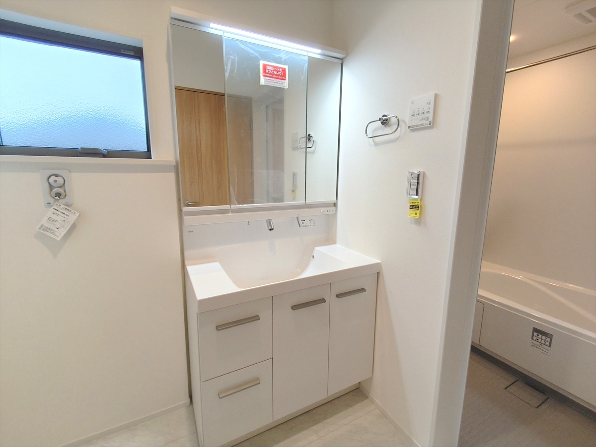 大きな三面鏡がついた洗面化粧台。鏡の裏にも収納があり洗面台がすっきりと片付きます。朝の身支度にも大変便利です。■国分寺市高木町1丁目 新築戸建て■
