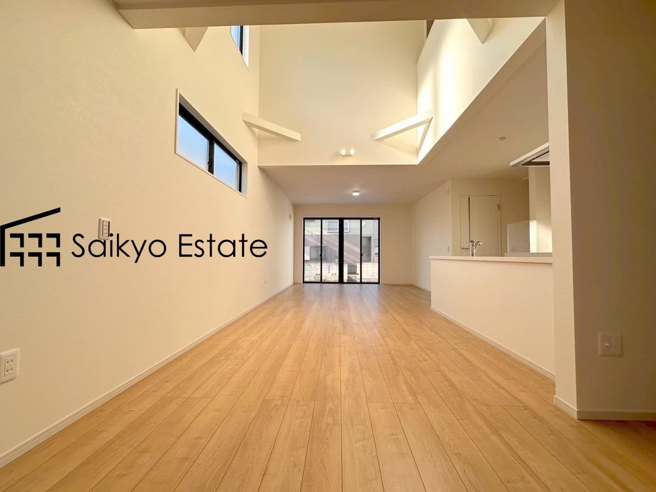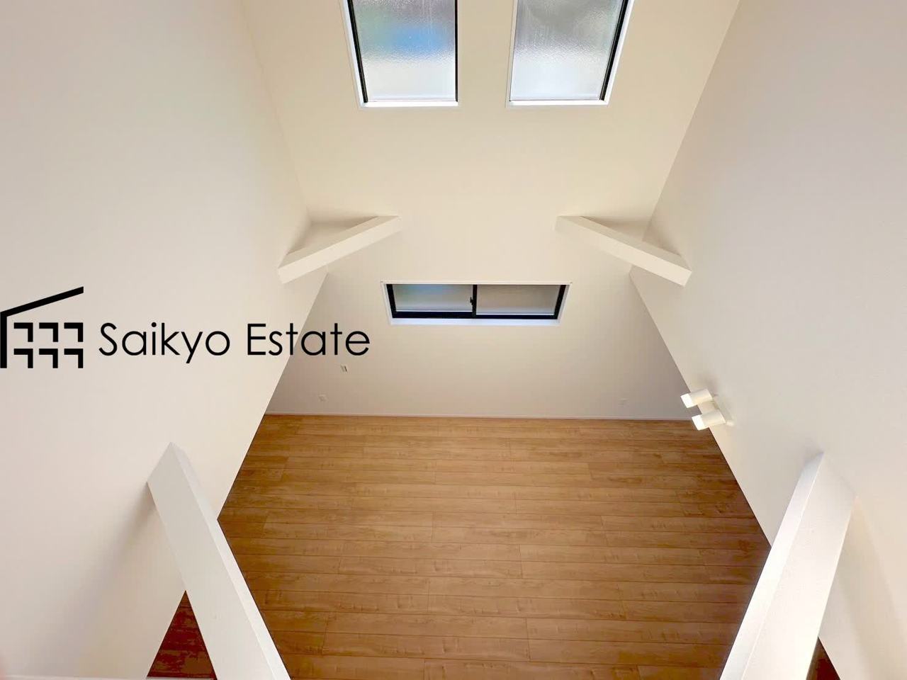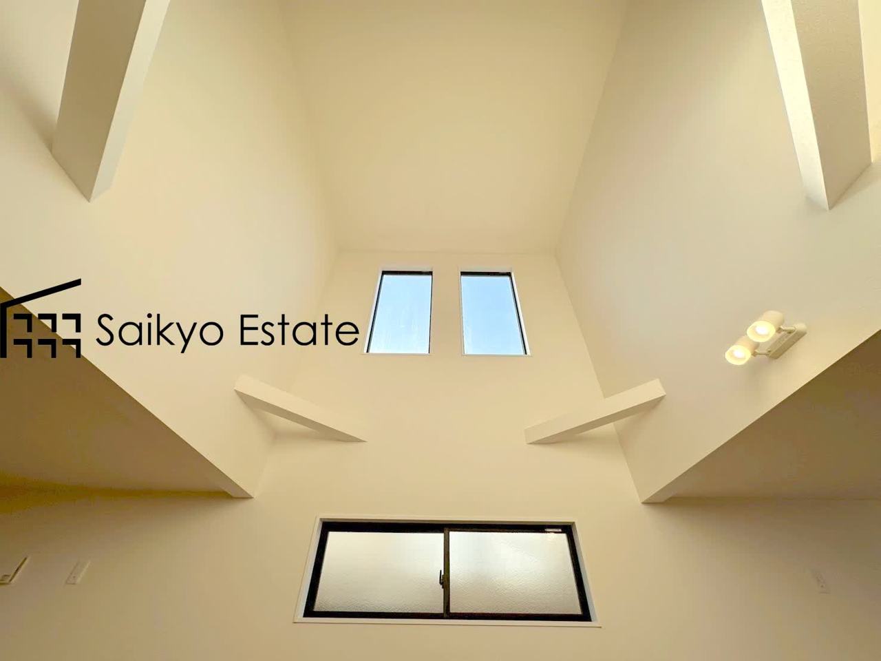 リビング上部は吹き抜けのため開放感ございます♪窓も多く、採光を取り込める面積が大きい事で明るく気持ちの良い空間となっております♪