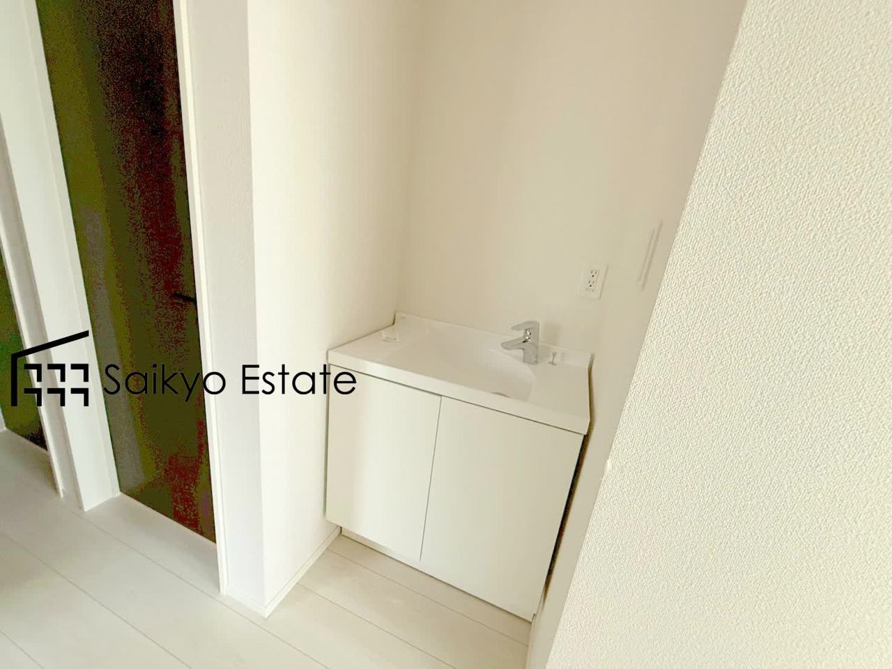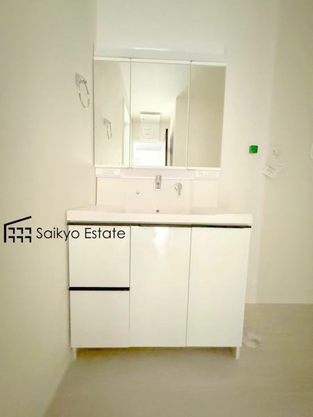 三面鏡付きの洗面化粧台を完備。収納スペースも十分ございますので、ドライヤーなどすっきりと片付きます♪