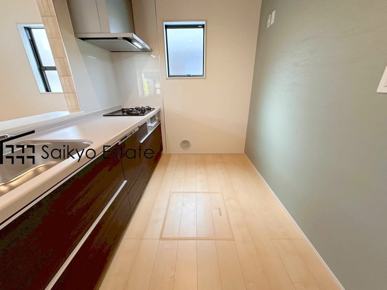 キッチンスペースは冷蔵庫や食器棚などを置くスペースが十分に確保されております。オシャレなカップボードを置きたくなりますね♪