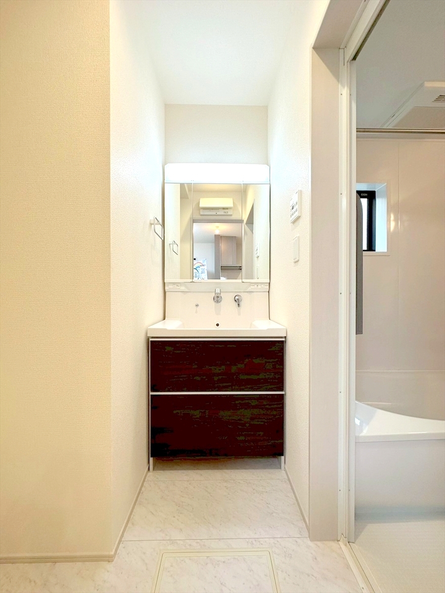 大きな三面鏡がついた洗面化粧台。鏡の裏にも収納があり洗面台がすっきりと片付きます。朝の身支度にも大変便利です。■調布市富士見町2 新築一戸建て■