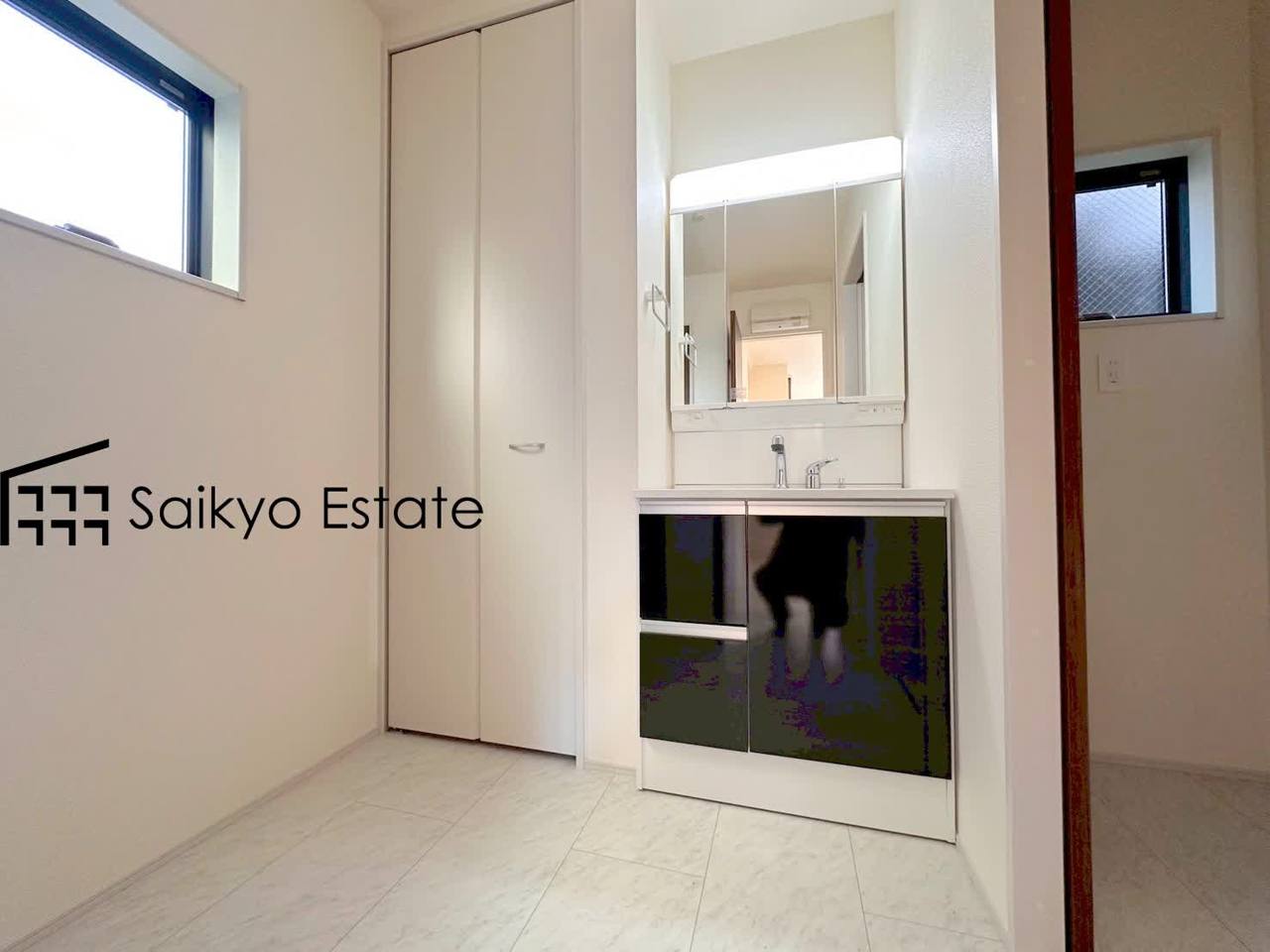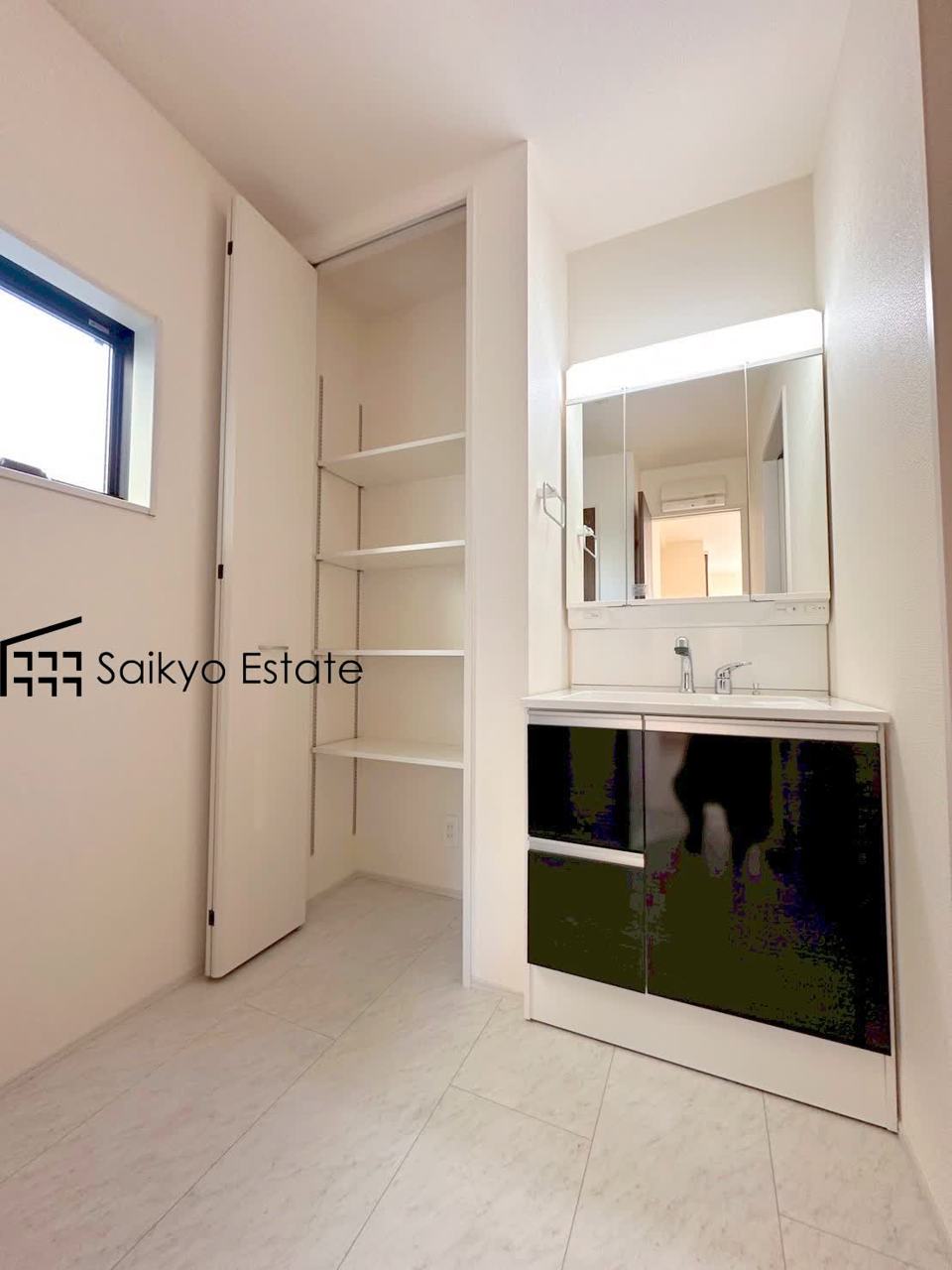 女性にはうれしいシャンプードレッサー付きの三面鏡洗面化粧台。収納スペースも十分ございますので、ドライヤーなどすっきりと片付きます♪