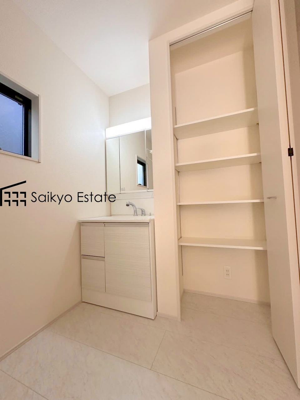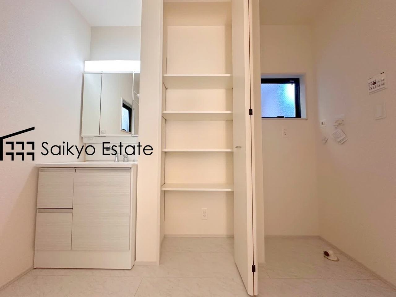 女性にはうれしいシャンプードレッサー付きの三面鏡洗面化粧台。収納スペースも十分ございますので、ドライヤーなどすっきりと片付きます♪