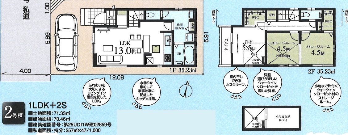 | 土地面積 | 71.33m² (私道257m²別に有、私道持分比率:47/1000) | ||