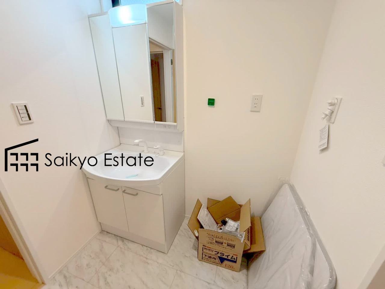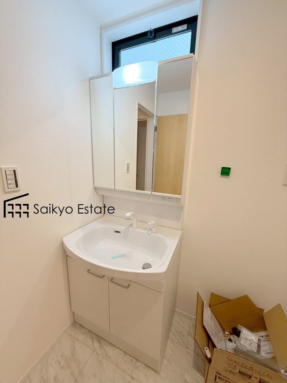 三面鏡付きの洗面化粧台を完備。収納スペースも十分ございますので、ドライヤーなどすっきりと片付きます♪